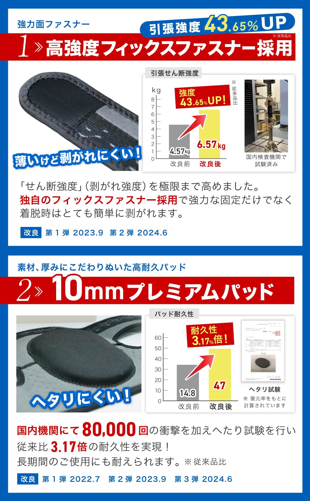 ?シリーズ累計販売数25,000枚突破!(2024.7現在)お客様からの貴重なご意見を基に常に製品の進化を続けいています。第1弾 パッドは素材、サイズなどに徹底的にこだわり、3倍以上の耐久性を実現しました。(復元率にて算出)第2弾 面ファスナー は強度検査を繰り返し、様々なの素材から厳選し、1.4倍の引張強度を実現!これにより、従来品よりも永くご使用いただける製品に仕上げました。ぜひその優れた性能をご体感ください。2024.6.27販売分よりさらに改良しています。
