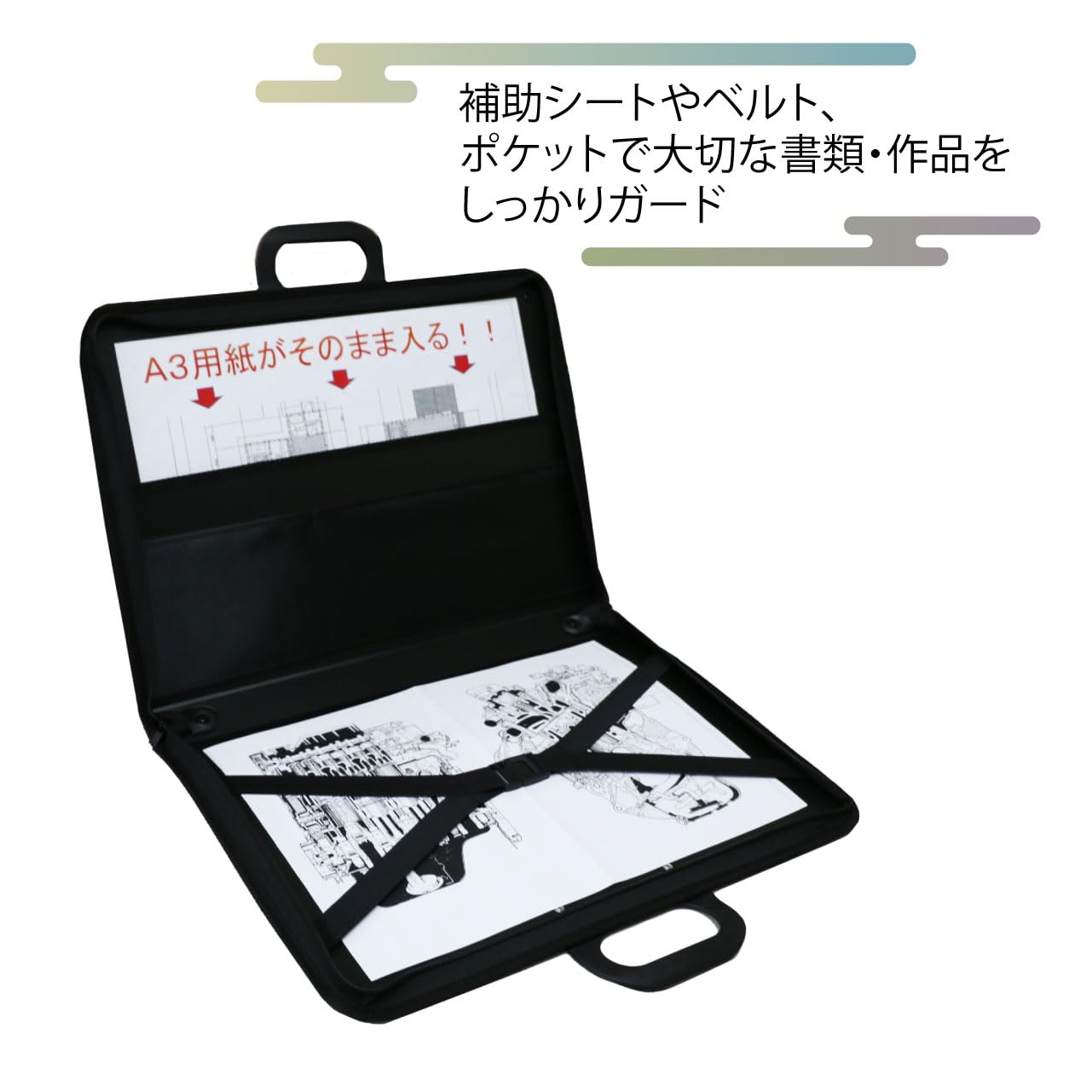内側には補助シートやベルトなど、大切な書類をしっかりガードする仕様