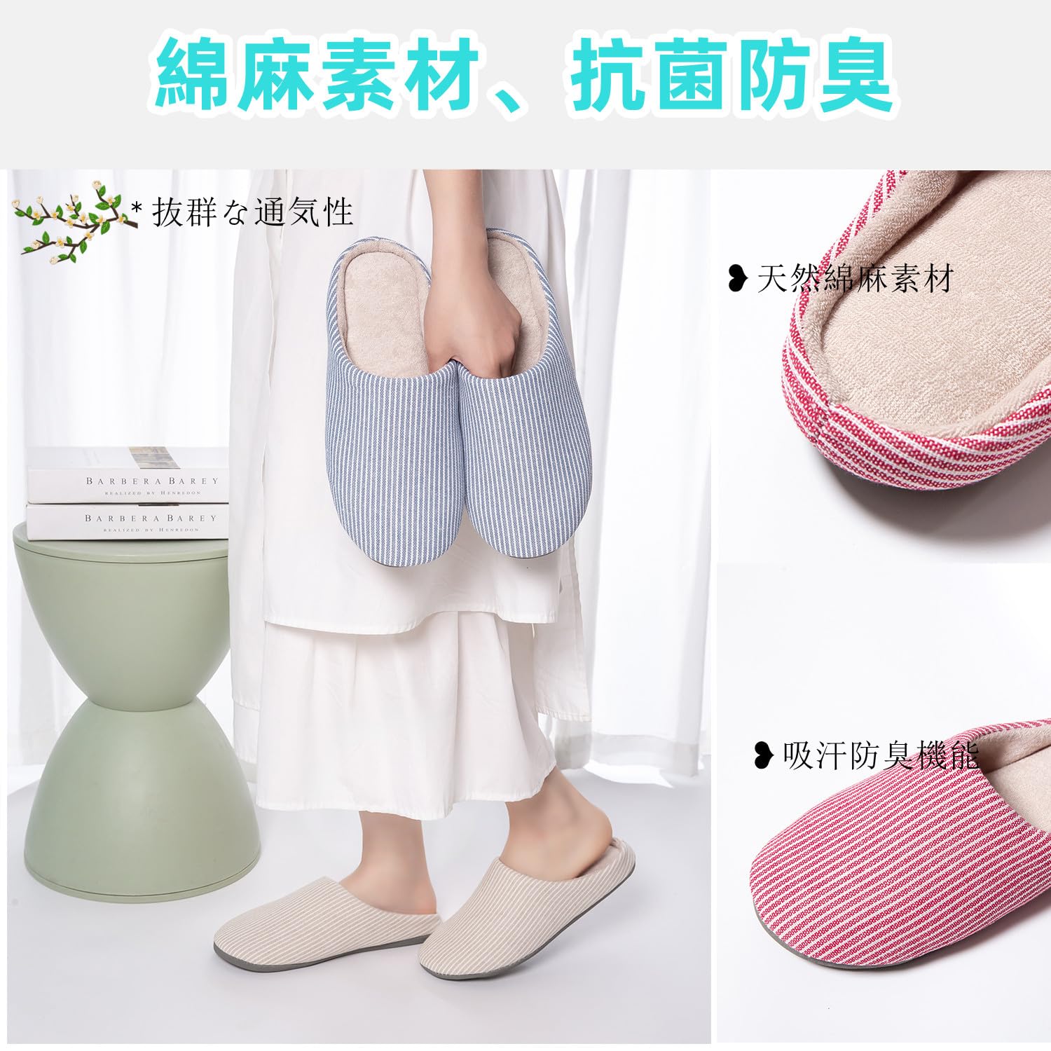 【洗濯可能】手洗いも洗濯機にも対応可能な洗えるスリッパです。Yoertemyストライプスリッパには、春、秋、冬の季節に活用できるルームシューズです。