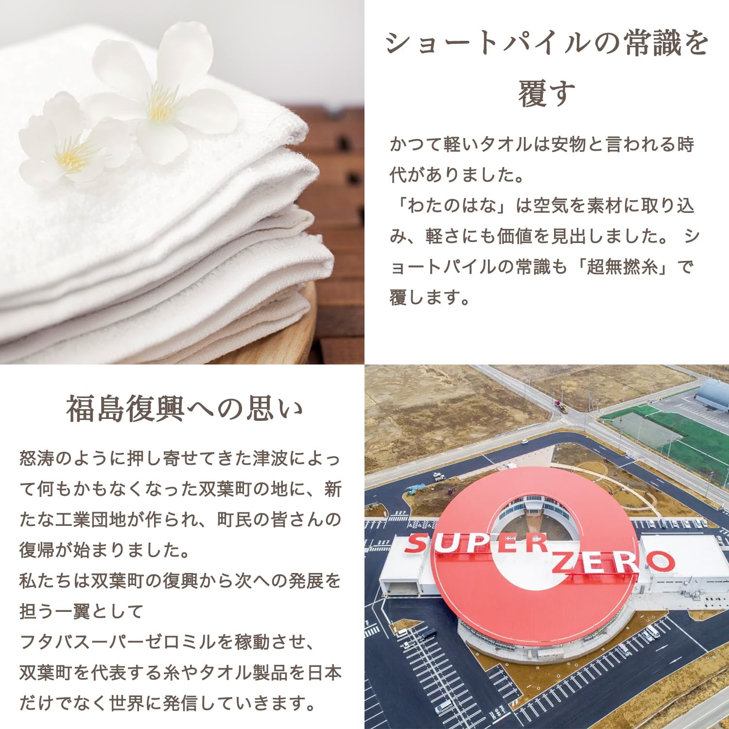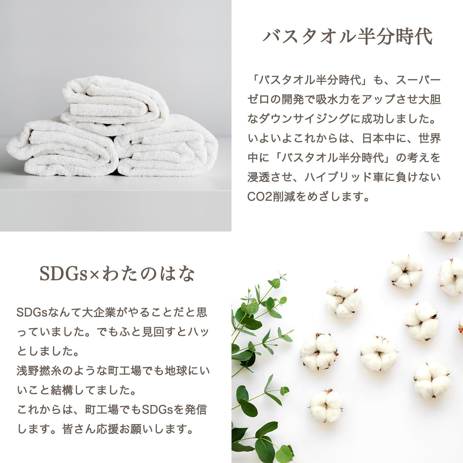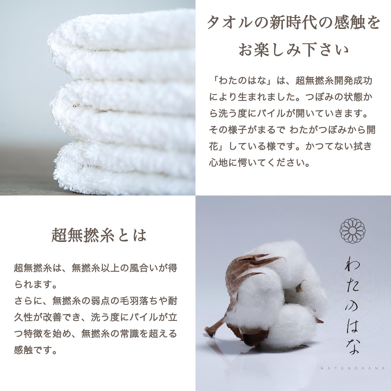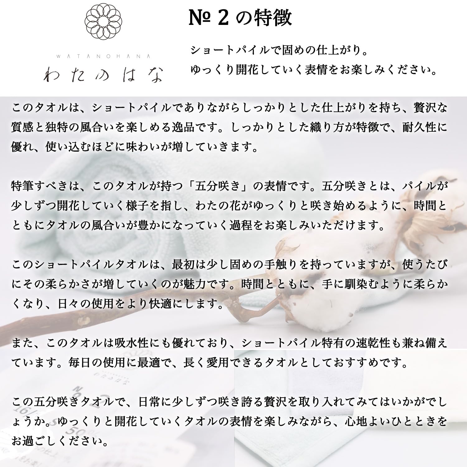 【「五分咲き」の優しい表情】パイルが少しずつ開花するような、心温まるタオルの変化。わたの花がゆっくりと咲き始めるように、時とともに優しく豊かな風合いに。