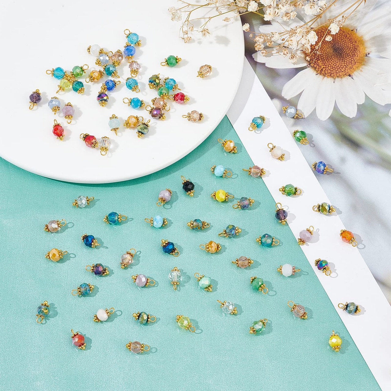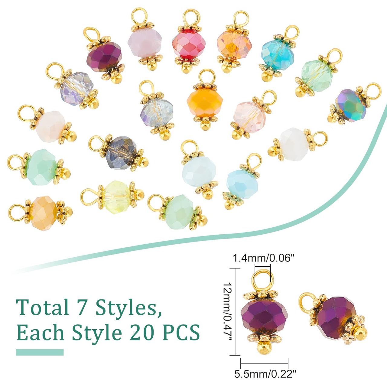 セット内容:電気メッキ加工を施したファセットガラスペンダント(7色)140個入り 各色20枚ずつ。 DIYジュエリーや、友人や家族へのプレゼントに十分な量です。 ガラスビーズは長さ約12mm、直径約5.5mmです。 穴の大きさは約1.4mmです。