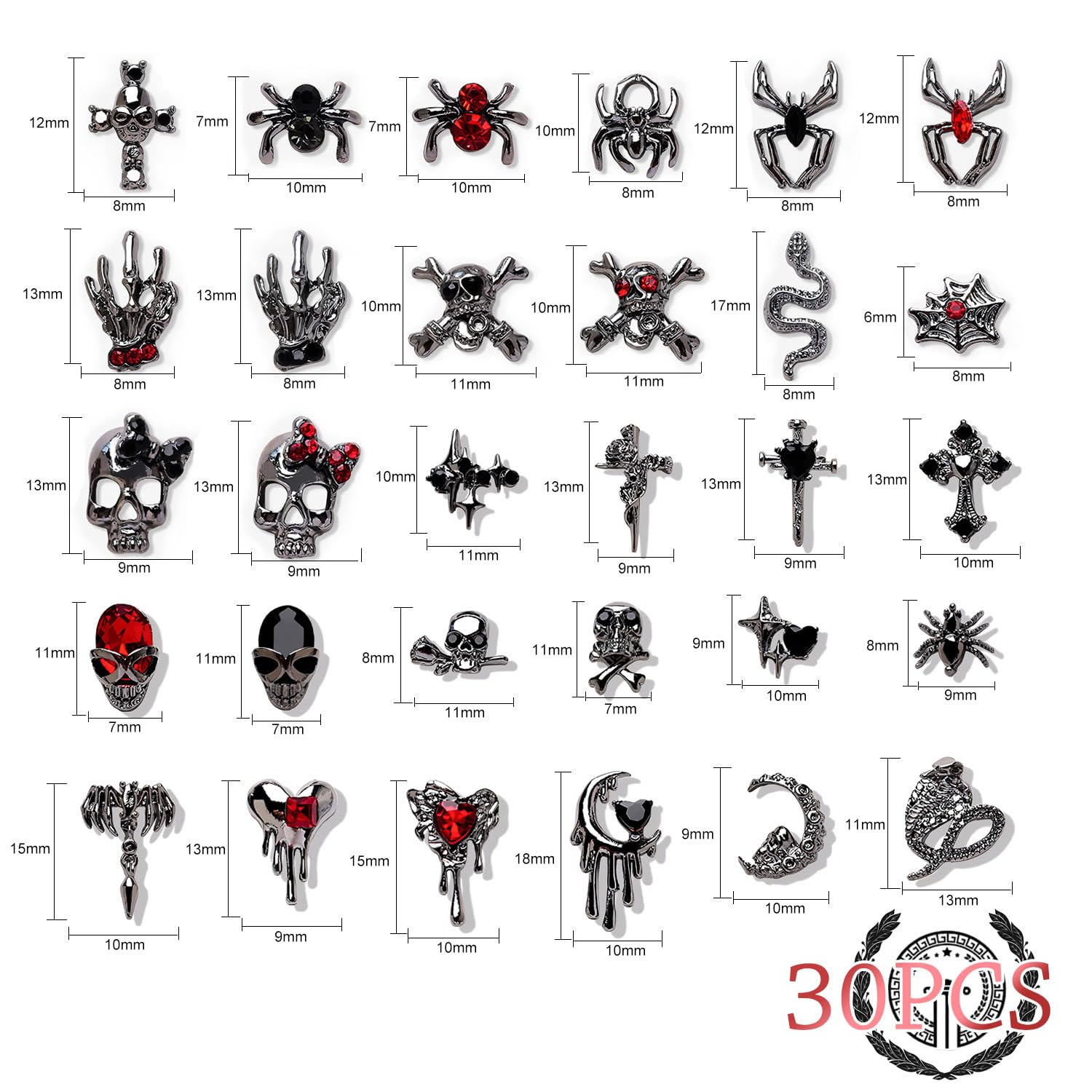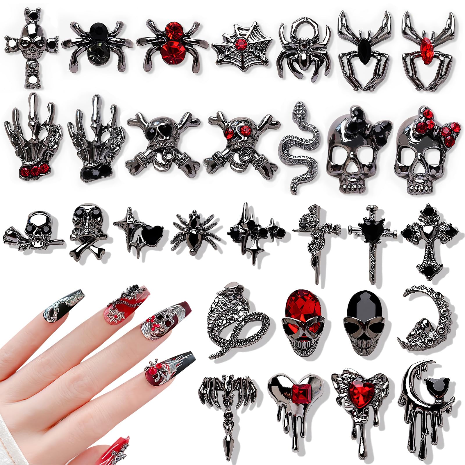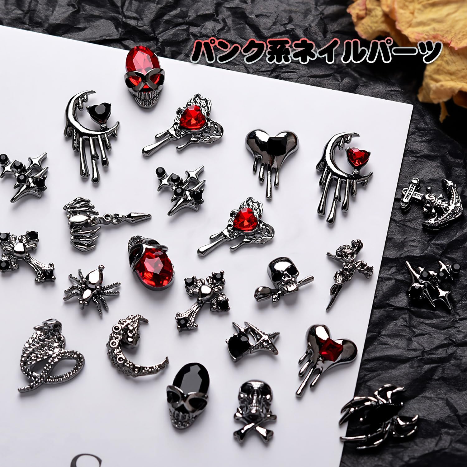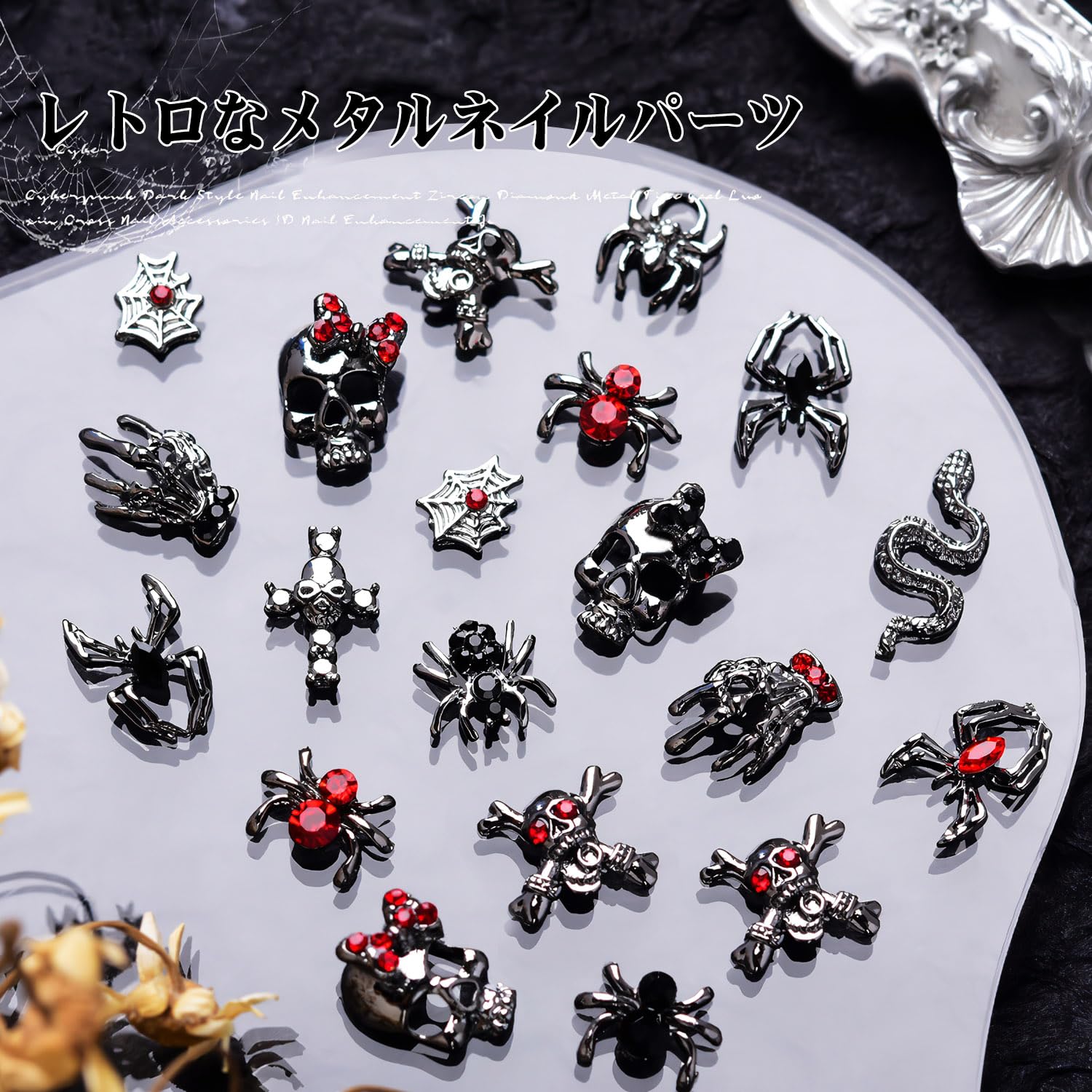 【多種類の大集合】セット内容:24種類で共に30個セットです。十字架、ドクロ、クモ、スカルハンド、ヘビ、ハートなど、パンクやゴシックのネイルパーツを一挙に満足させてくれます