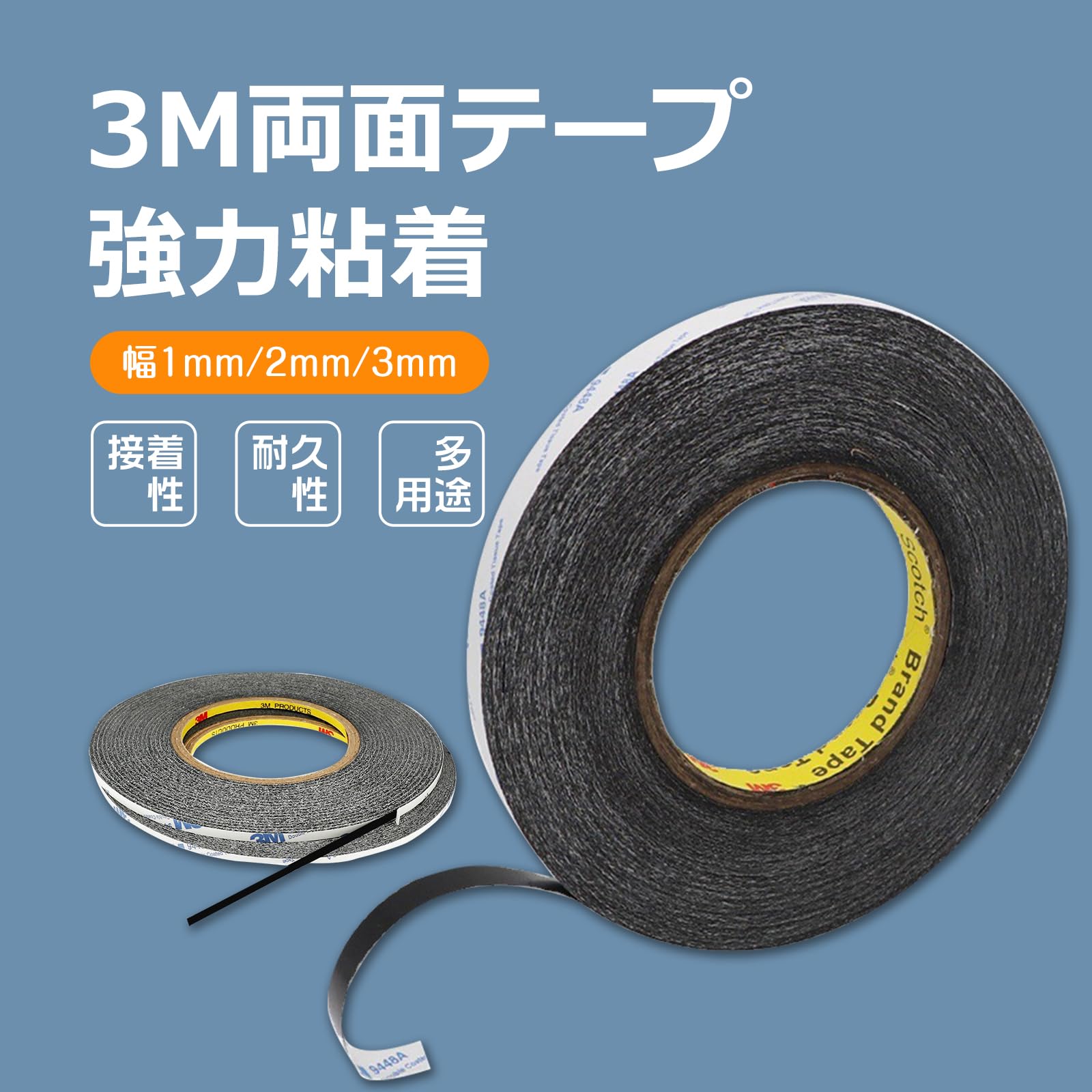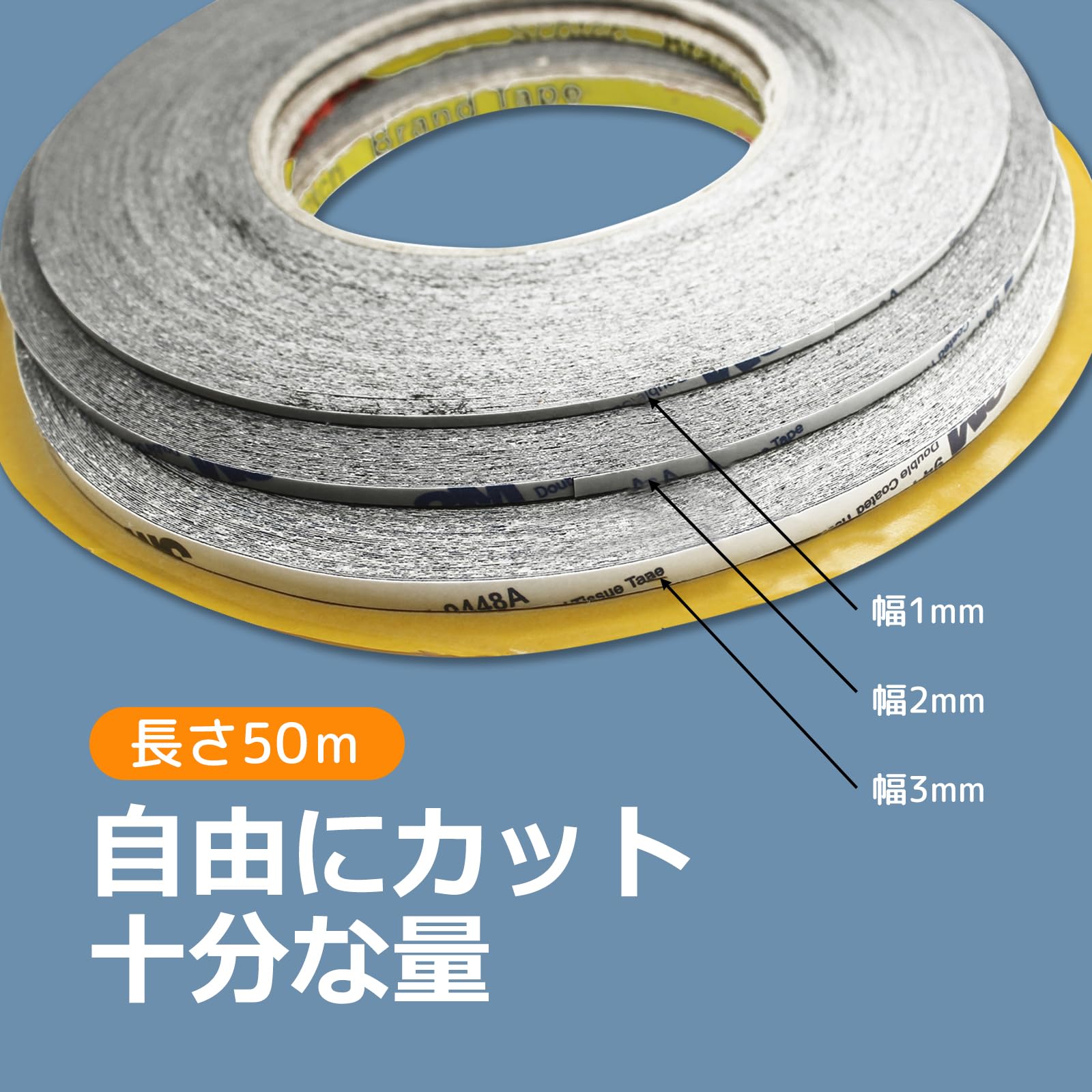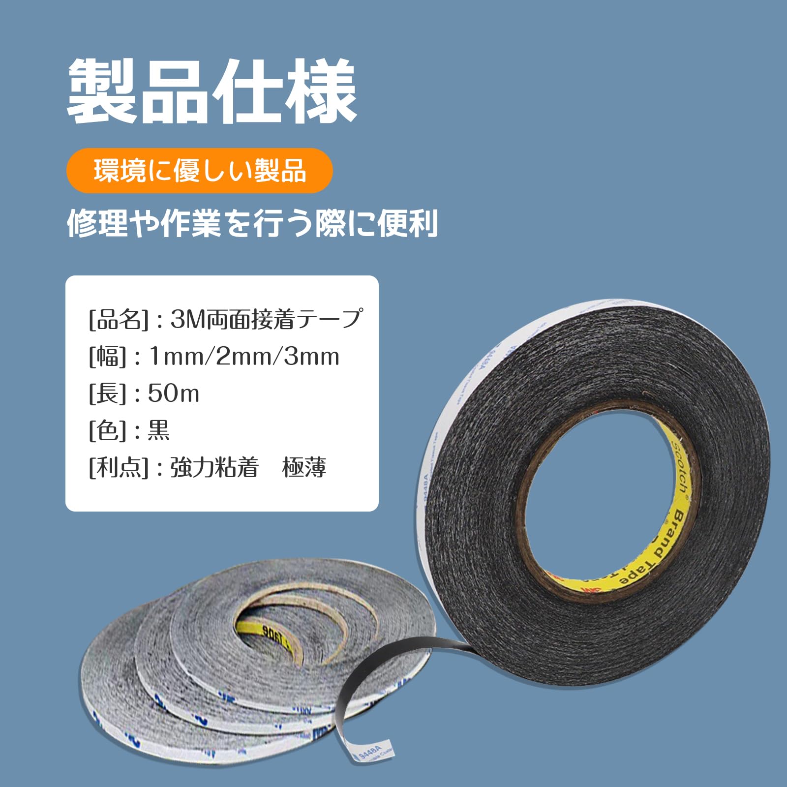 【十分な長さ】両面接着テープは黒色で、3本セットで、幅が1mm、2mm、3mmという異なるサイズで提供されています。長さはいずれも50mとなっており、修理や設置作業に十分な量が提供されています。自分の必要な長さにカットして使うこともできます。