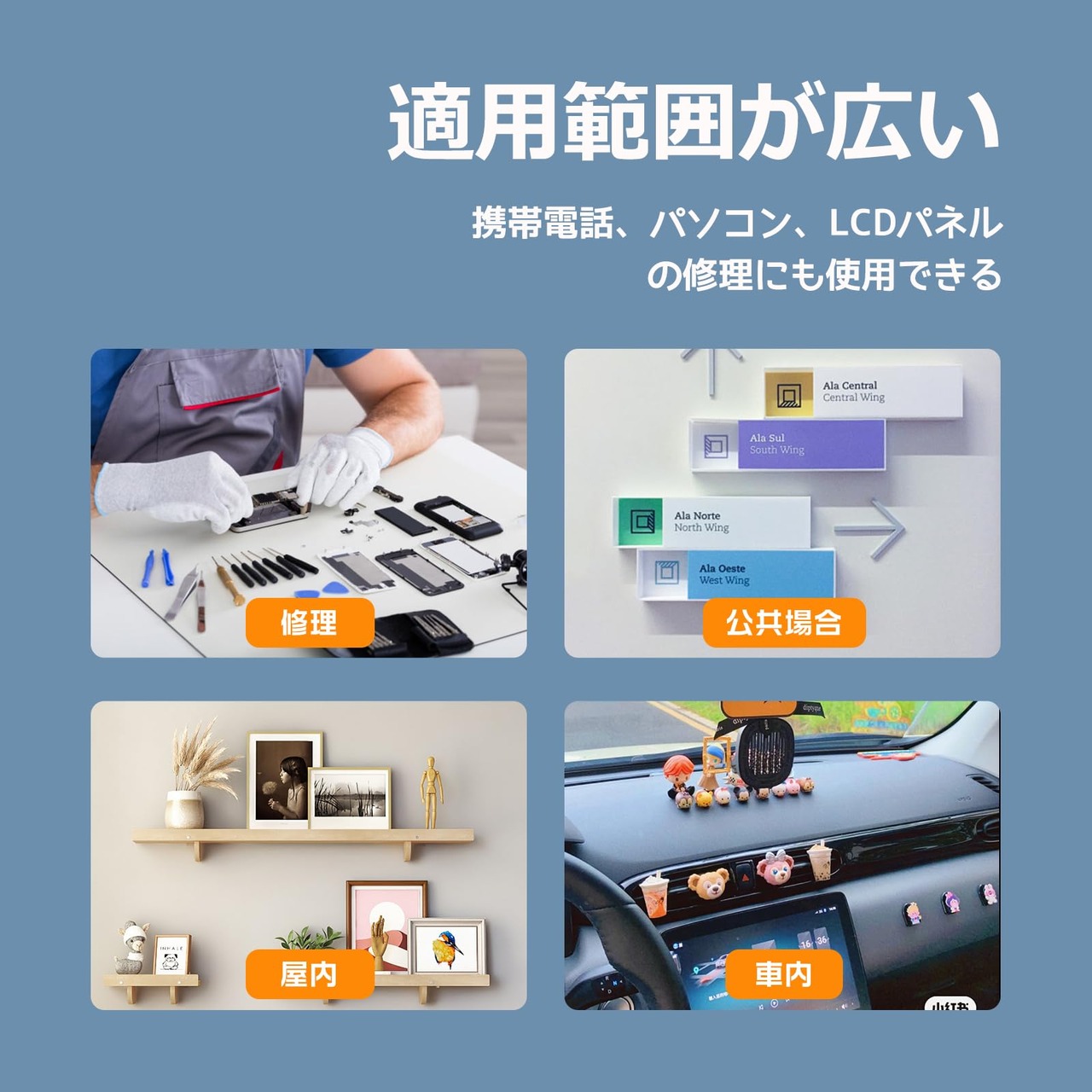 【適用範囲が広い】携帯電話のパーツやボタンの接着に使用することができます。タブレットPCやノートパソコンのタッチパネル、キーボード、ヒンジの修理時に使用されます。バッテリーの固定、LCDパネルペーストの型抜き、液晶パネルディスプレイの修理にも使用できます。