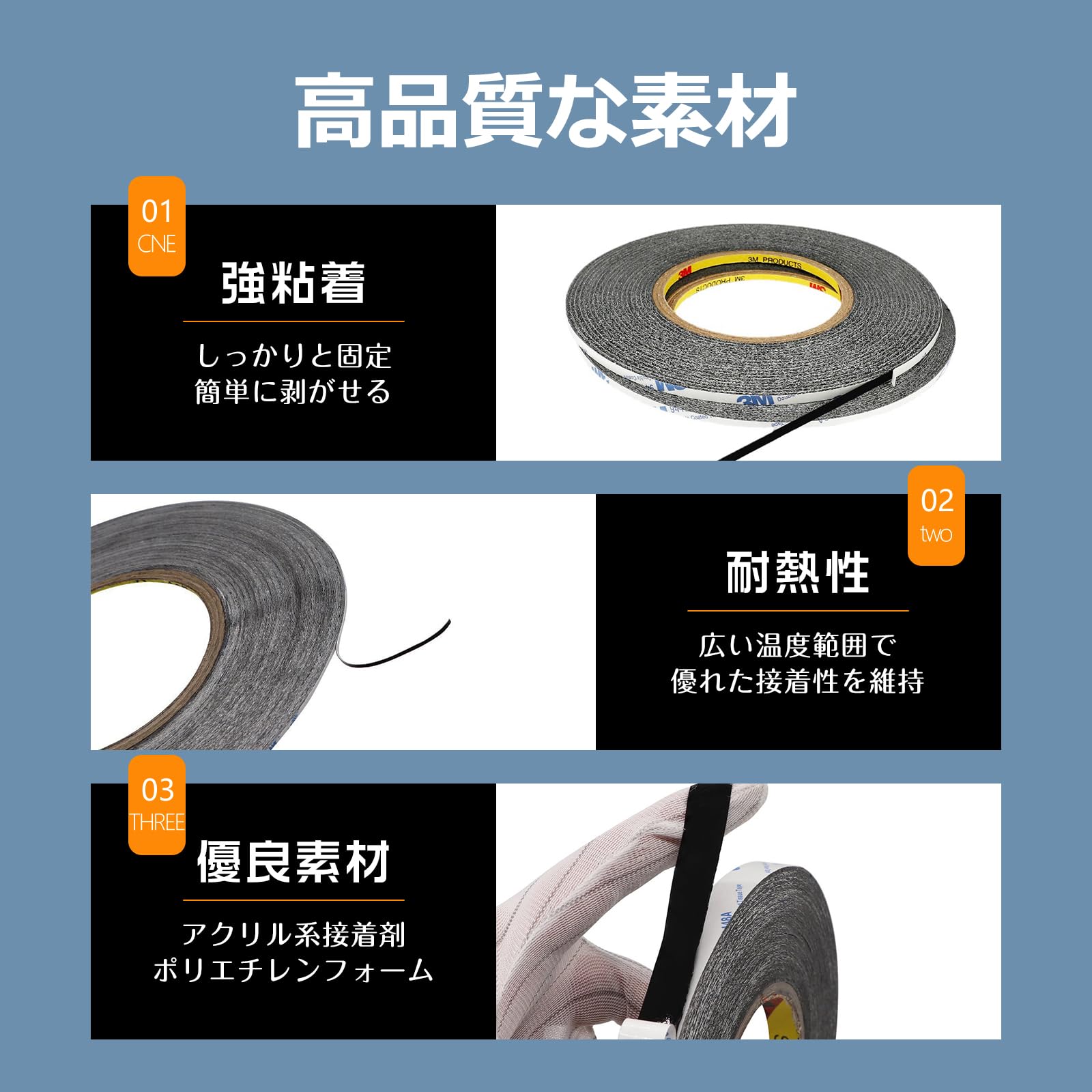 【高品質な素材】3M両面接着テープは、特殊アクリル系接着剤とシニアポリエチレンフォームで作られており、無毒であり、安全に使用することができます。繰り返しの負荷や外部要因に対しても強い耐久性を持ち、長期間の使用にも耐えることができます。環境に優しい製品です。