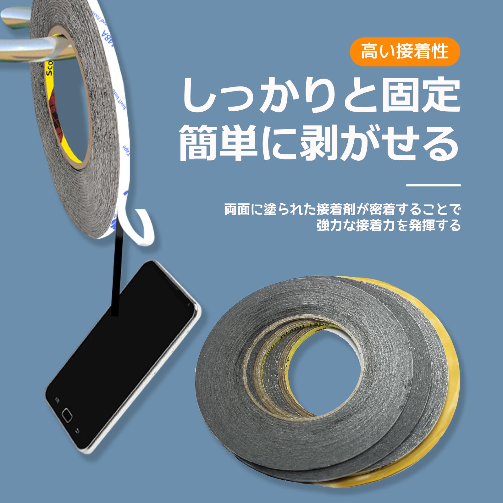 【高い接着性・簡単に剥がす】テープの両面に塗られた接着剤が密着することで、強力な接着力を発揮します。接着する材料同士をしっかりと固定することができます。広い温度範囲で優れた接着性を維持し、接着力が低下することはありません。接着したテープを簡単に剥がすことができ、テープを再利用する場合や、修理や交換作業を行う際に便利です。