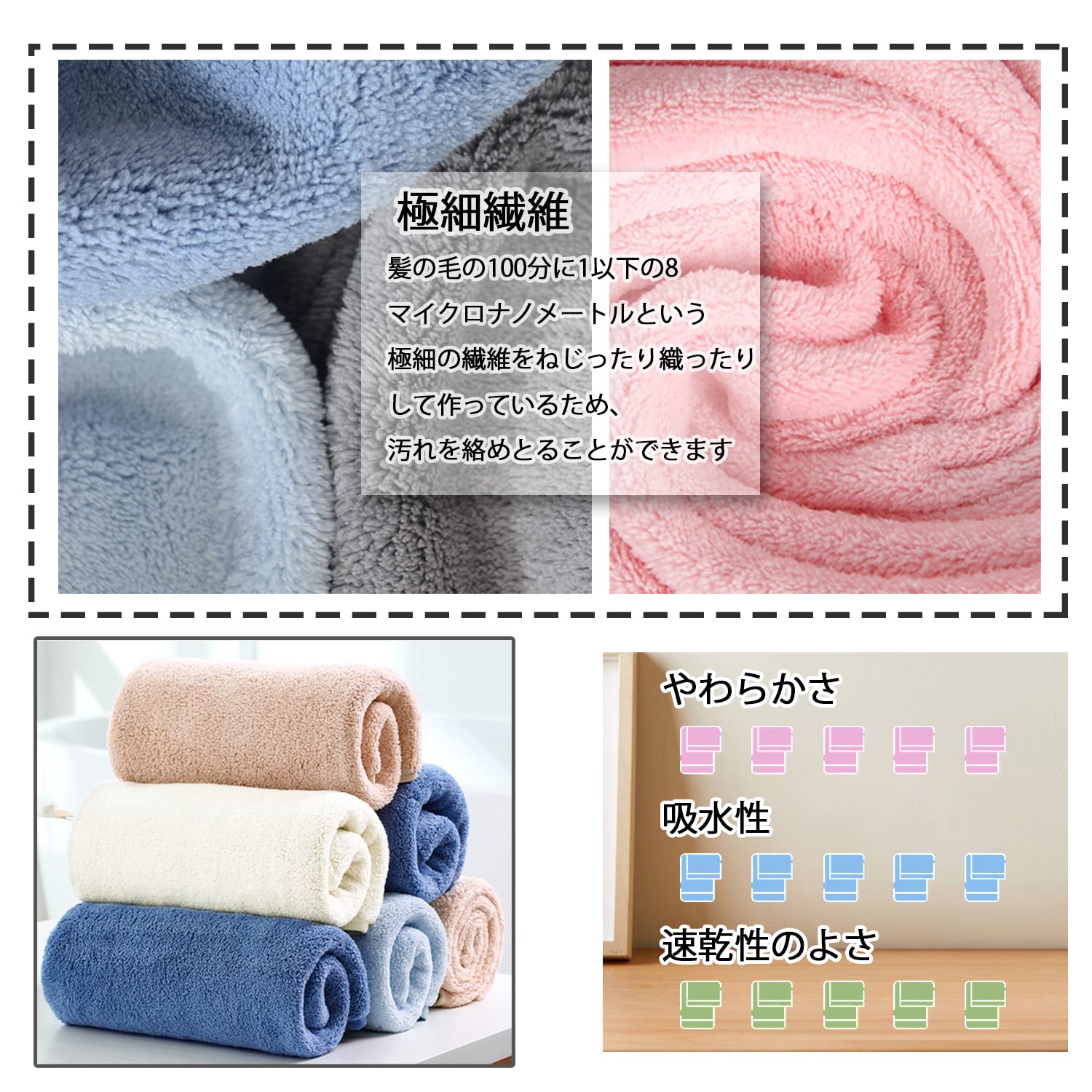 【高速吸水】綿の約3倍の吸水力があるマイクロファイバーバスタオル。体を拭くときは、ゴシゴシとこすらず、水分をしっかりキャッチ。軽く肌に当てて優しく拭きます。高い吸水性で時間がかかるドライヤーも時短に!髪への負担を軽減するお手伝います。