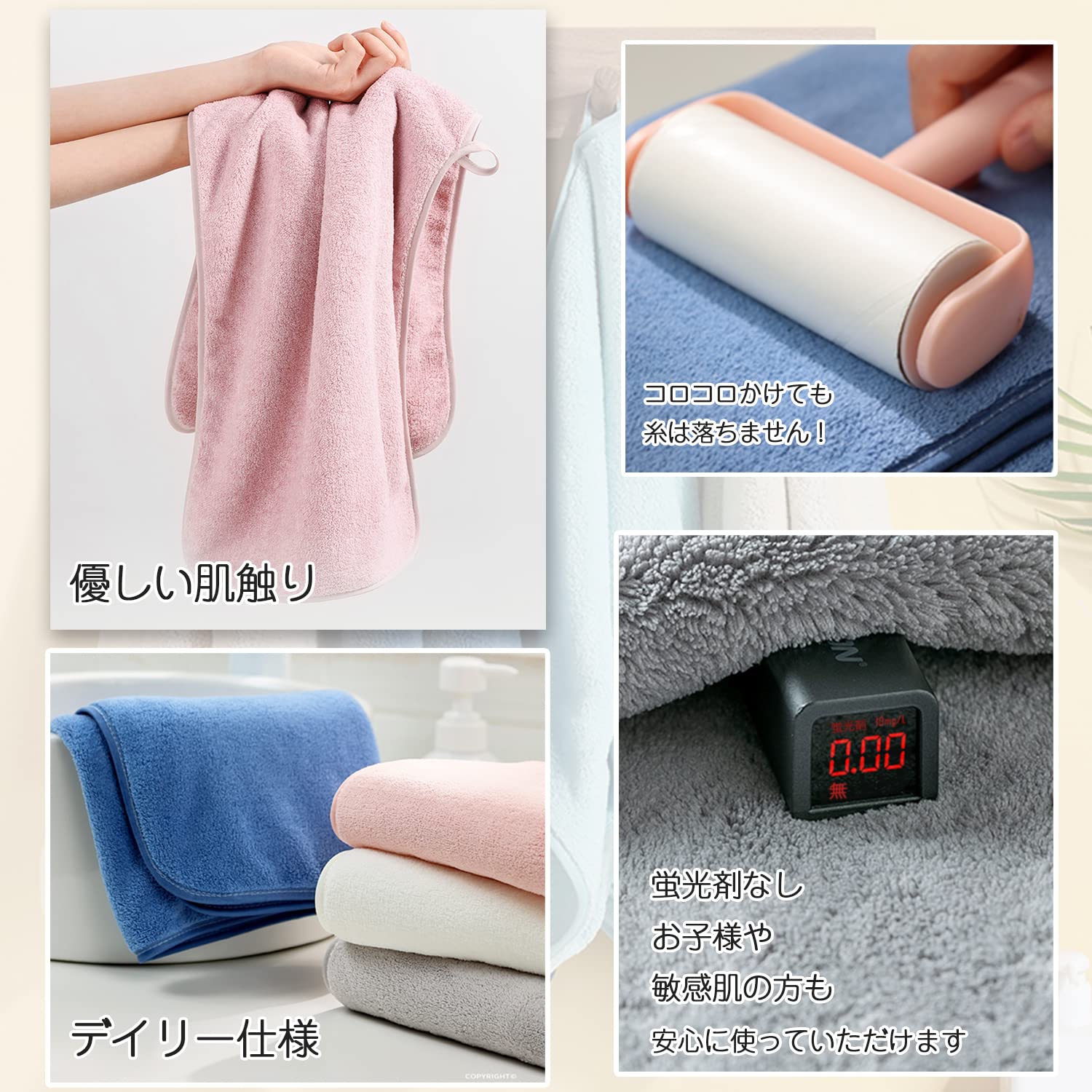 【ふわふわとした肌触り】極細マイクロファイバーを高密度で編み上げていて、きめが細かく、繊維が長くて、肌に触れただけでふわふわの感じ、しなやかな毛布ような肌ざわりに包みこまれみたいです。やわらかく、しっとりとした肌触りが気持ち良い。