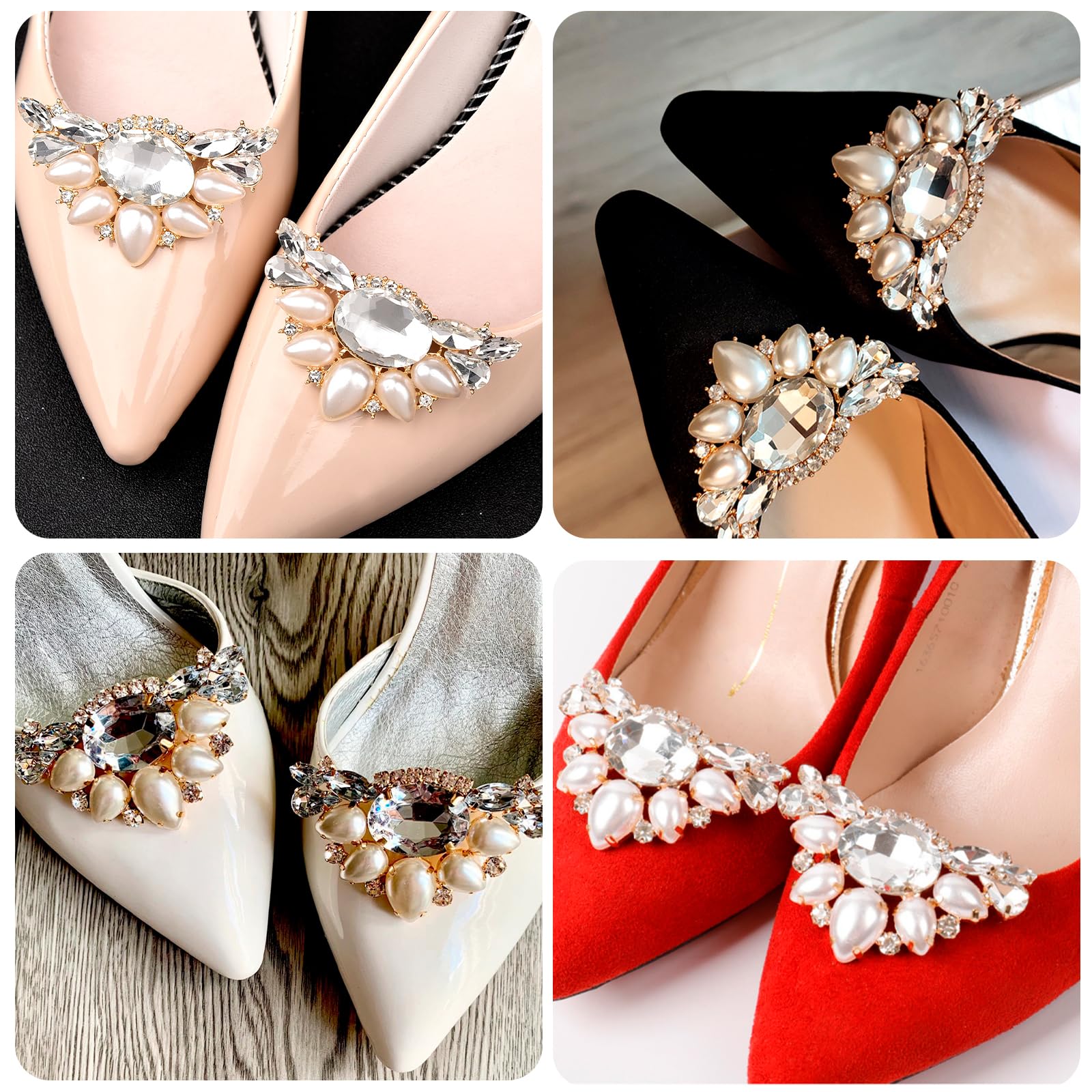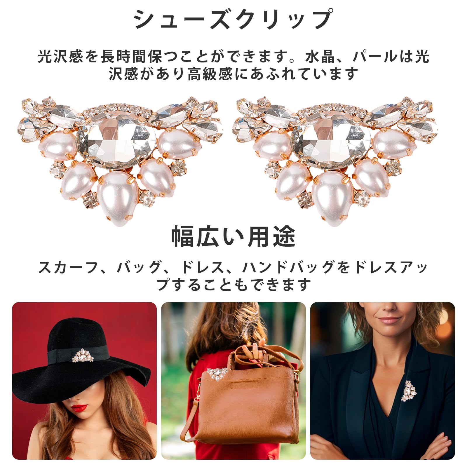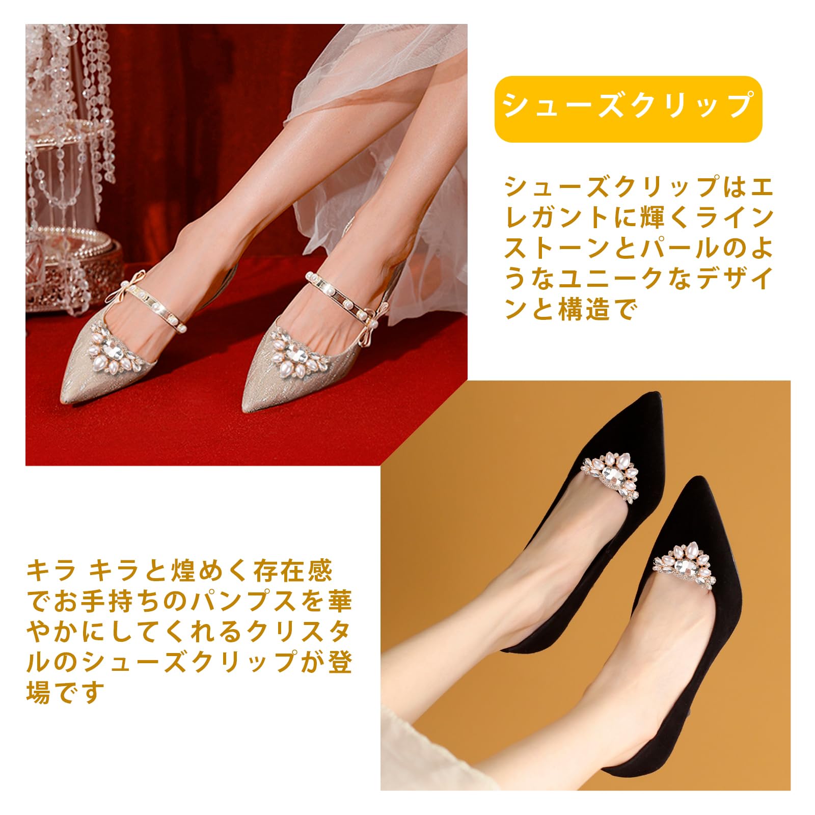 【シューズクリップ】シューズクリップはエレガントに輝くラインストーンとパールのようなユニークなデザインと構造で、光沢感と高級感があり、エレガントな印象を与えています。異なるシュークリップで外観を変更することができます。キラ キラと煌めく存在感でお手持ちのパンプスを華やかにしてくれるクリスタルのシューズクリップが登場です。