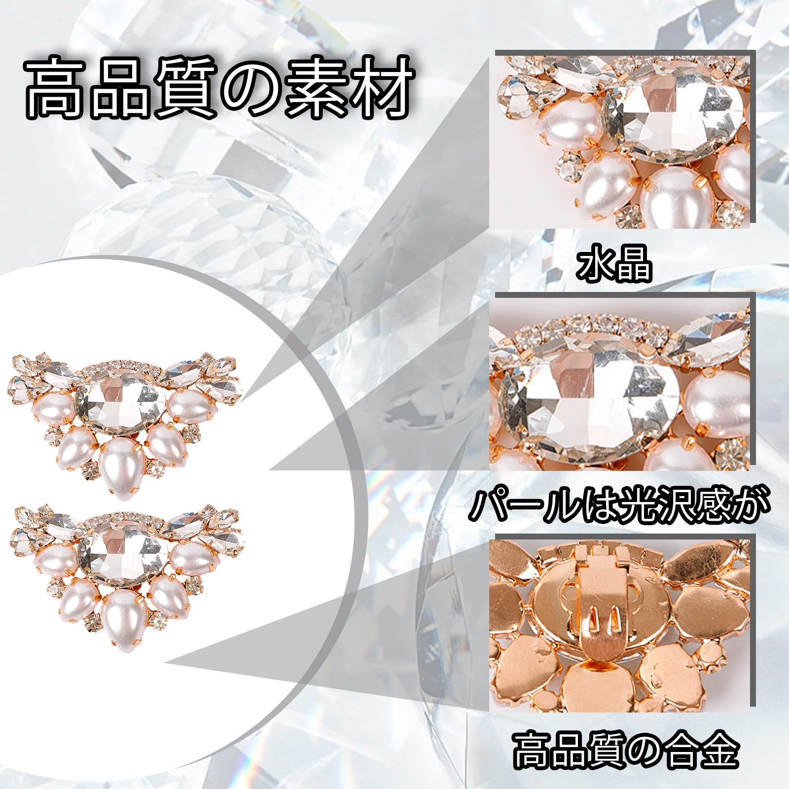 【高品質の素材】シューズクリップは高品質の合金と水晶、パール材質を用いて製作し、丈夫で耐久性があり、防水、錆びにくく、真珠が落ちにくく、磨耗に強く、光沢感を長時間保つことができます。水晶、パールは光沢感があり高級感にあふれています。