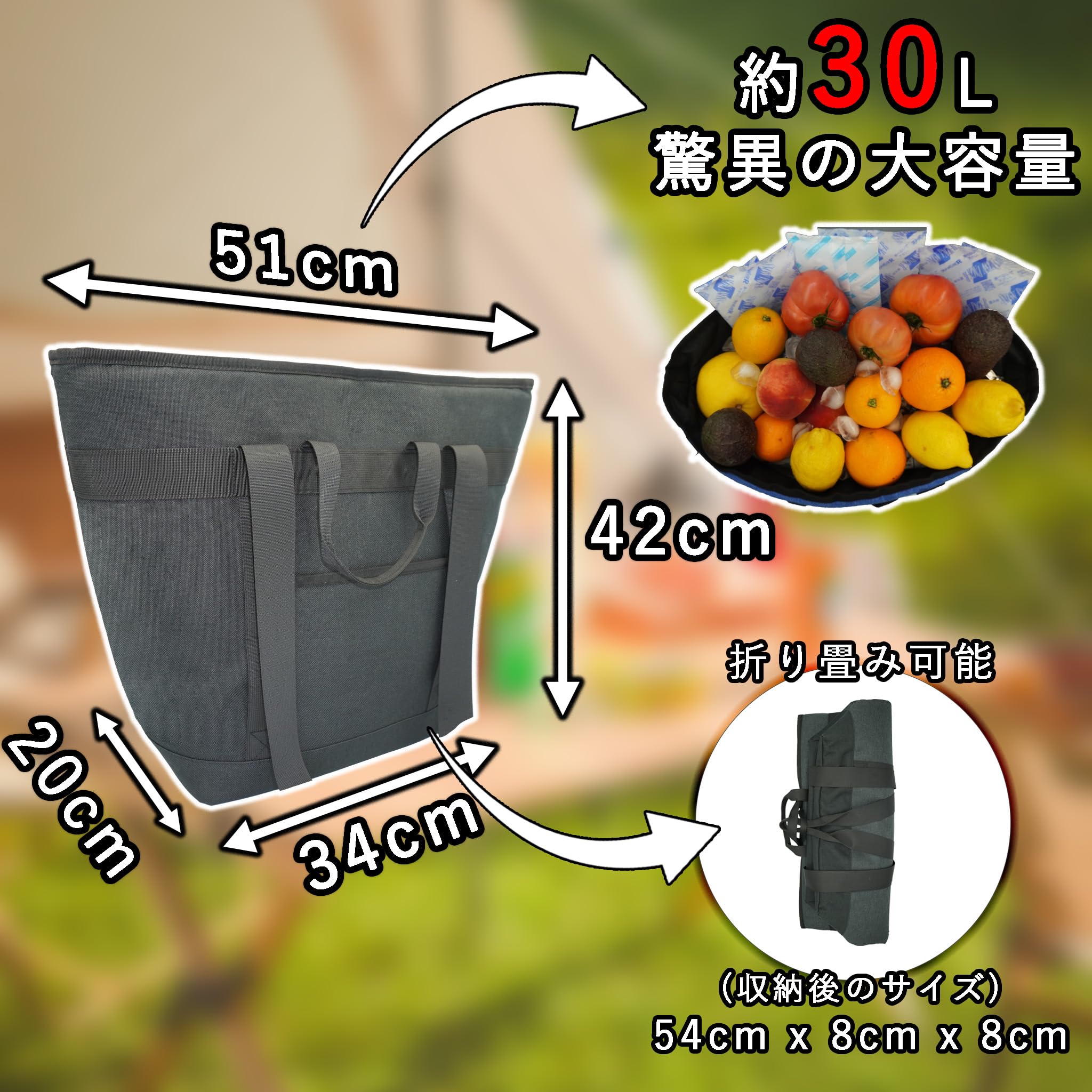 【さまざまな用途】 アウトドアキャンプや学校の運動会など、長時間の保冷が必要な場面に最適です。スーパーの買い物袋としても使用でき、多用途に活躍します。肩に掛けても、背負っても、手提げでも使用可能なデザインで、収納も簡単です。優れた保冷・保温性能を提供し、最大30Lの大容量で、外装と内装には防水素材を使用しています。