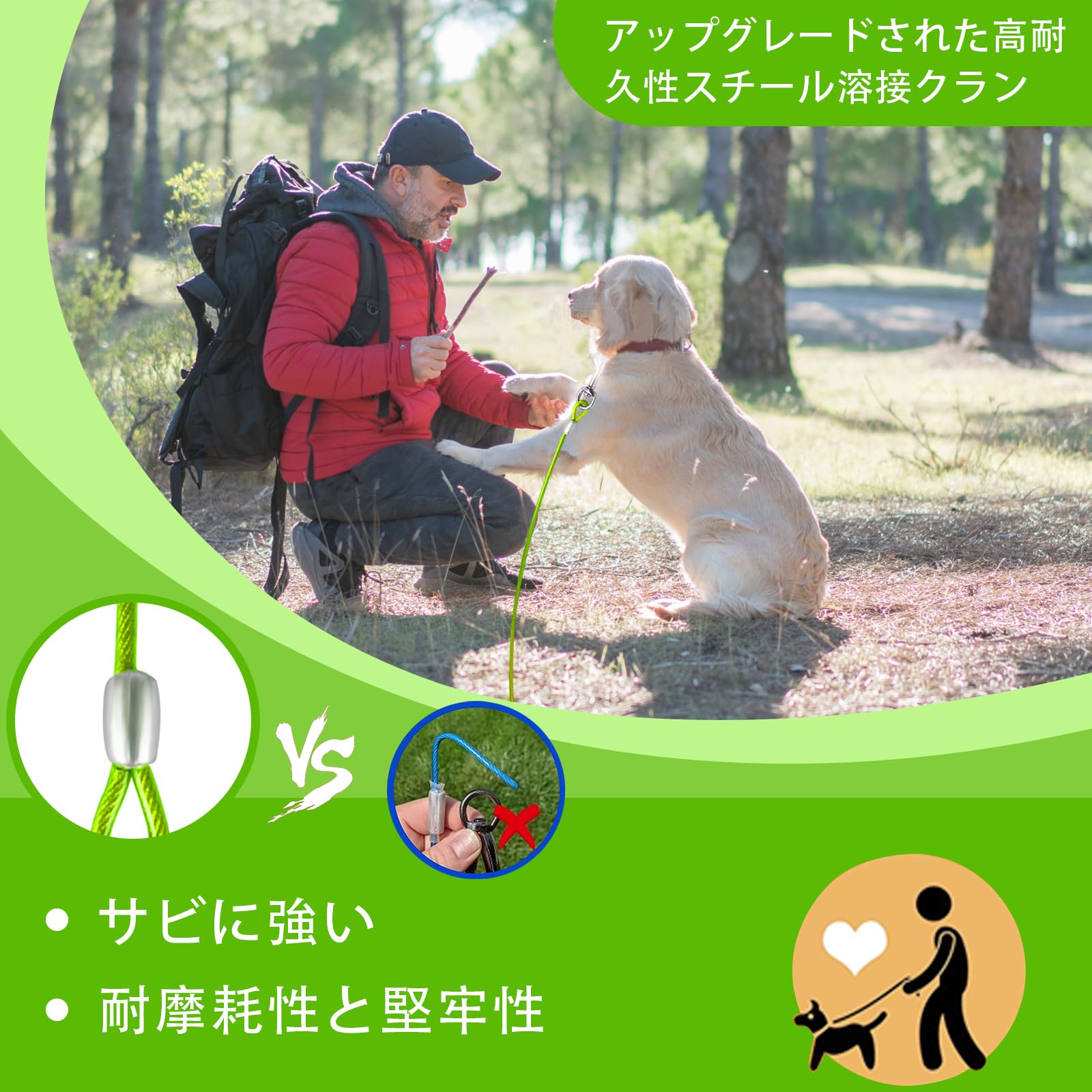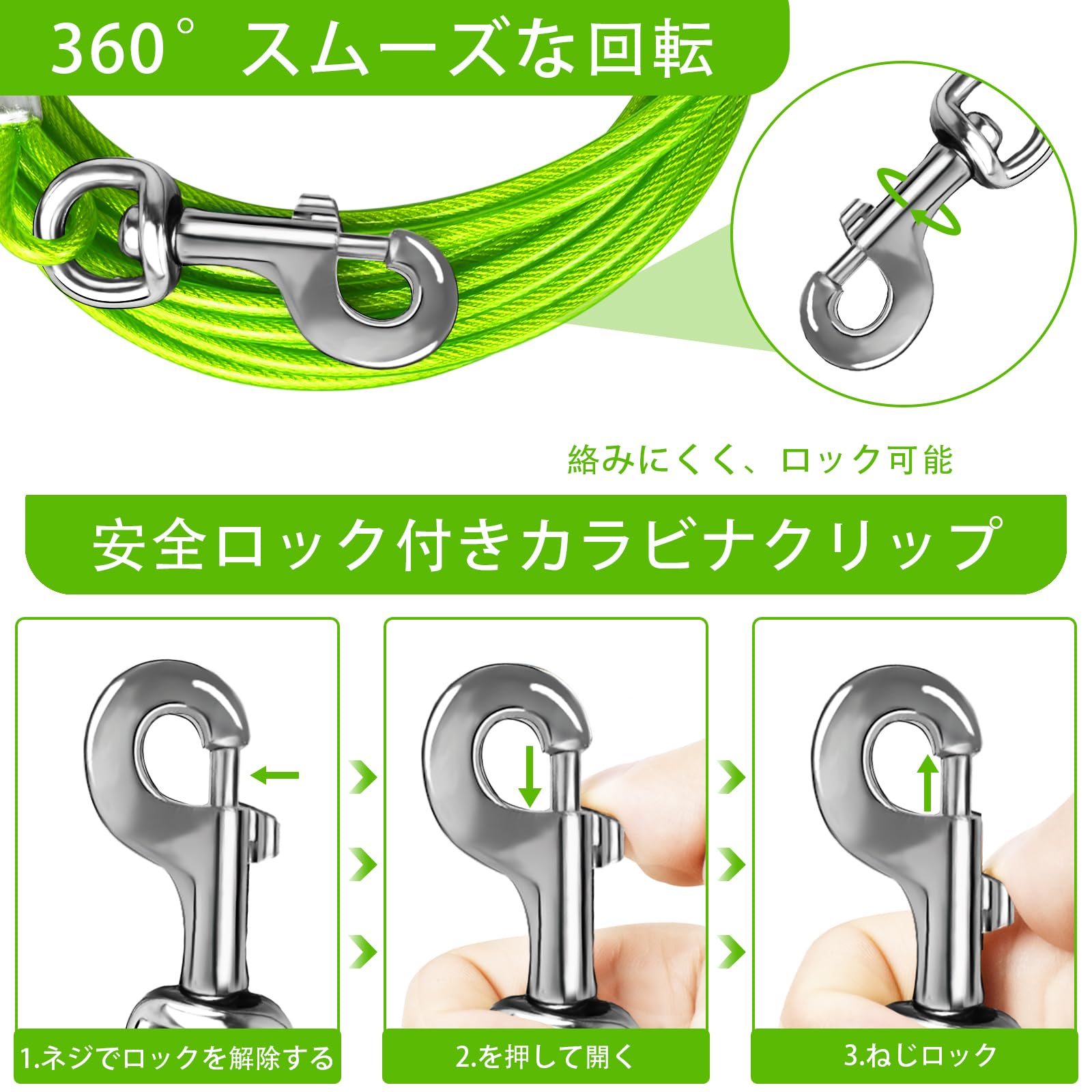 アドバンスド・クリップ:回転クリップは360°回転することができ、あなたの犬が絡まることなく移動するためのより多くのスペースを提供します。また、ペットがケーブルから外れて危険な目に遭うことも防げます。