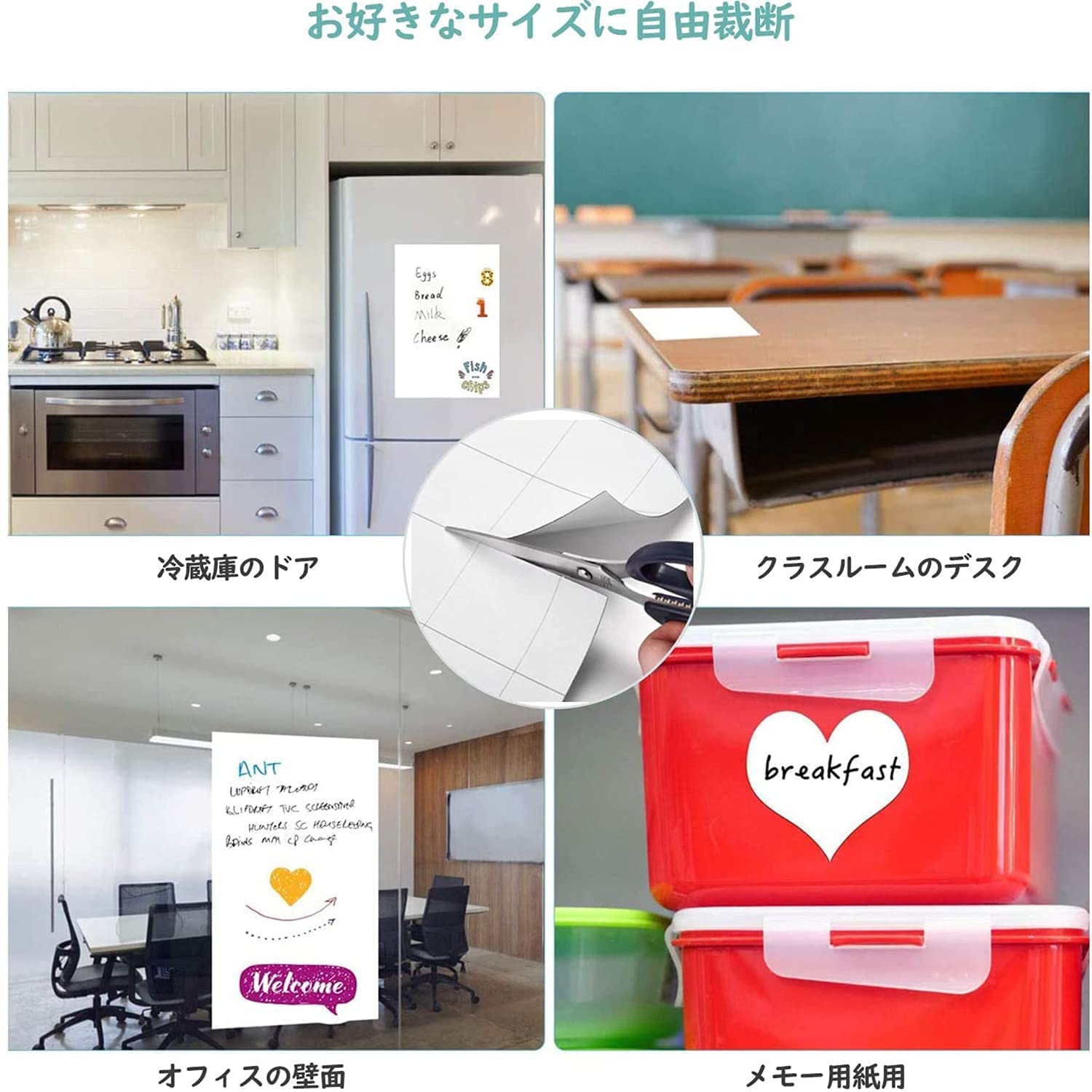 自由に裁断】サイズは90x120cm(無地)で、壁や家具に合わせて必要なサイズや好きな形を切り抜き、汎用性が高いです。平壁、ガラス、キッチン、天井、金属面に直接に貼られて、使いやすく、女性の方やお年寄りでもお気軽に使えます。事務所の予定表、掲示板の知らせ、こどもの落書き、壁に貼り買い物リストなど様々な場所に使えるホワイトボードシートです