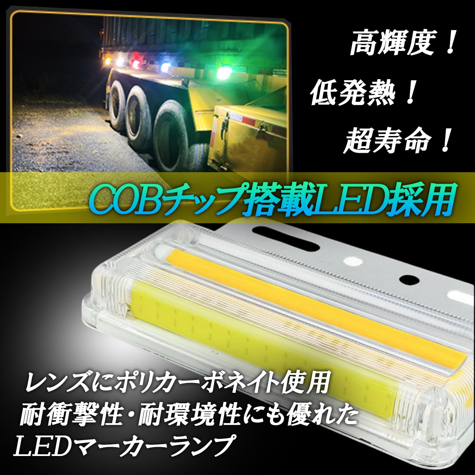 【仕様】マーカーランプ24vトラック用ledはLEDに高輝度COB LEDを採用することにより、夜間、悪天候の環境においても他の車両に注意を促す事が可能です。Iedマーカーランプ24Vの発光部は正面及びサイド、ダウンライトを搭載し広範囲に光を照射し、全方位照射を実現しました。
