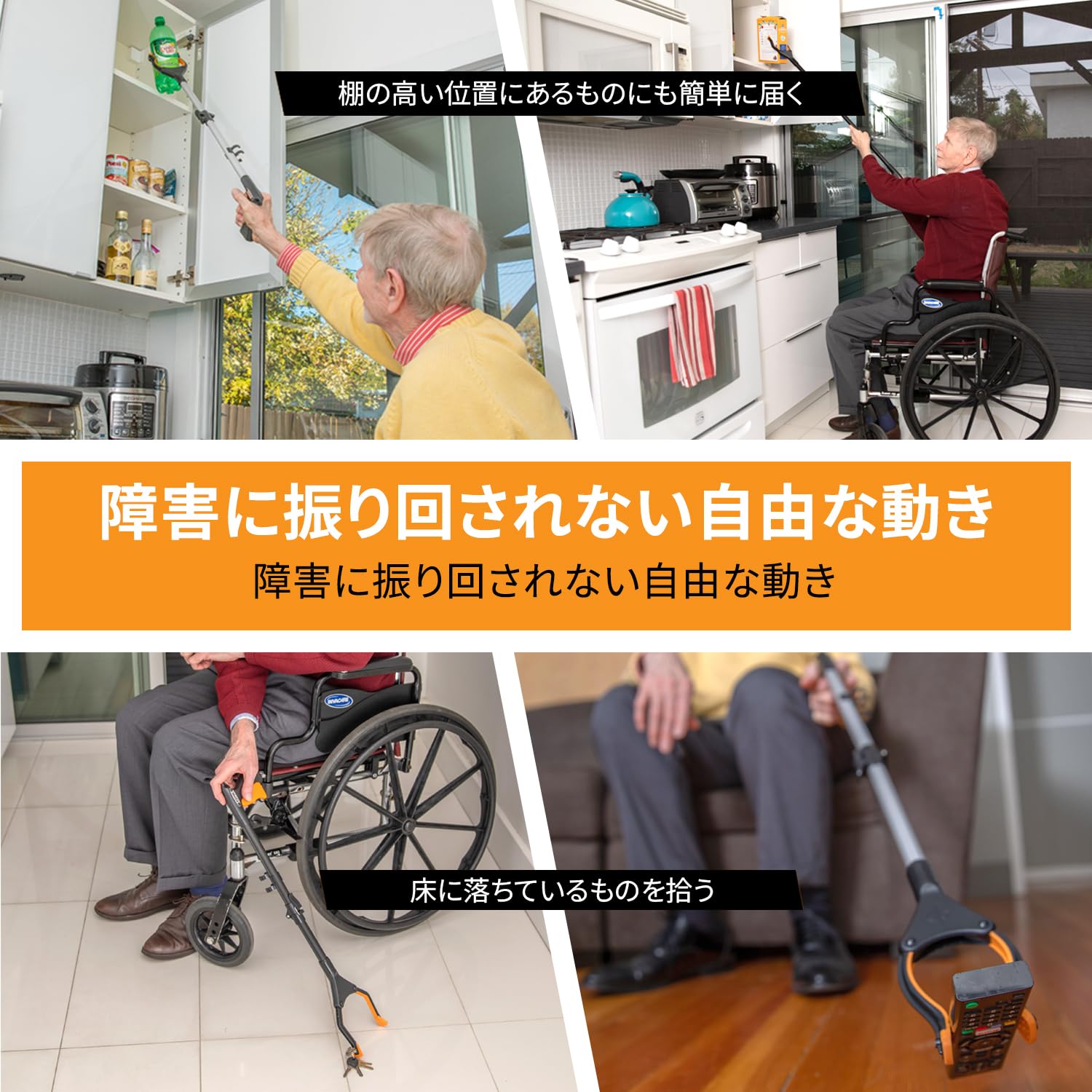 簡単操作で誰でも使いやすい:直感的に扱える誰にでも使いやすい設計で、年齢や身体に不自由を抱えていたり、移動が困難な方でも誰でも手軽に、手の届きにくい場所にある物を掴むことができます。日常生活のお助けハンドとして自立サポートに役立ち、あらゆる方の生活の利便性を高めます。