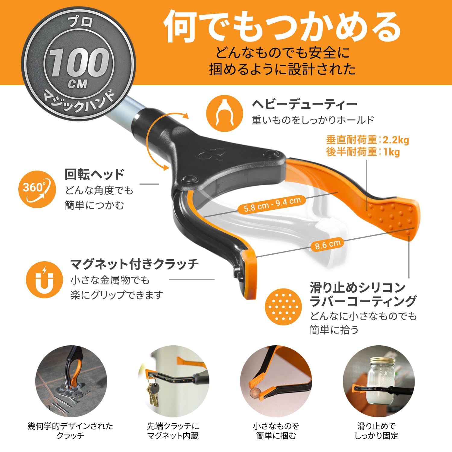 頑丈な耐荷重:特許取得済みの大型ラッチ(つかみ部分)を搭載したマジックハンド。キャッチ部により、最大約2.2kgまでの物を垂直方向にしっかり持ち上げることができます。リーチャー本体が曲がることなく、どんな物もしっかりと安全に掴めるつかみ棒です。