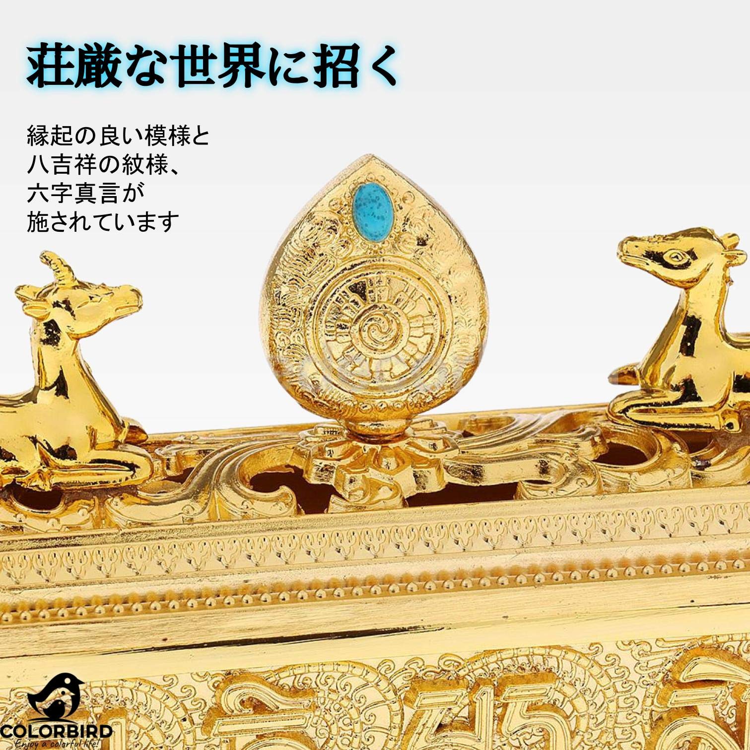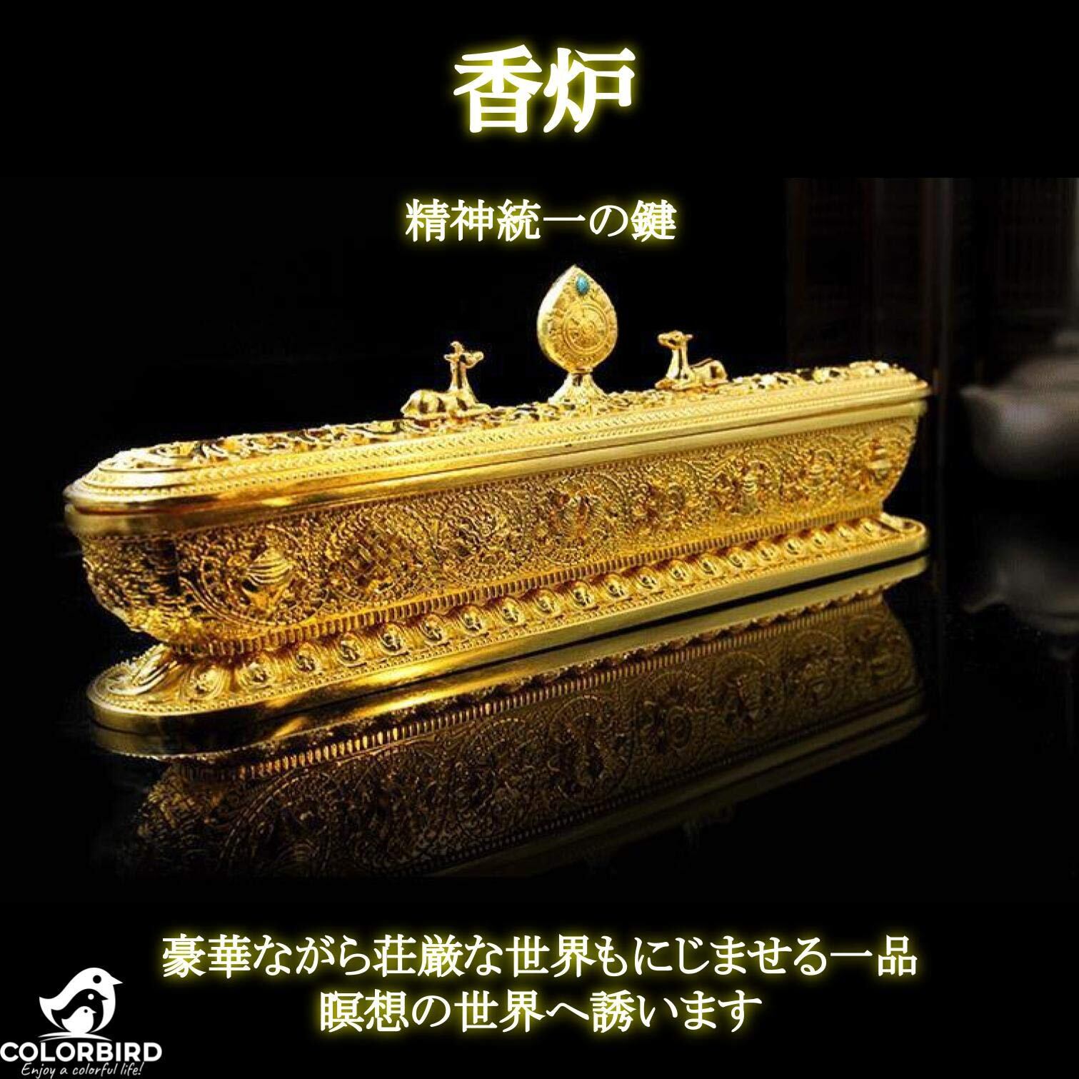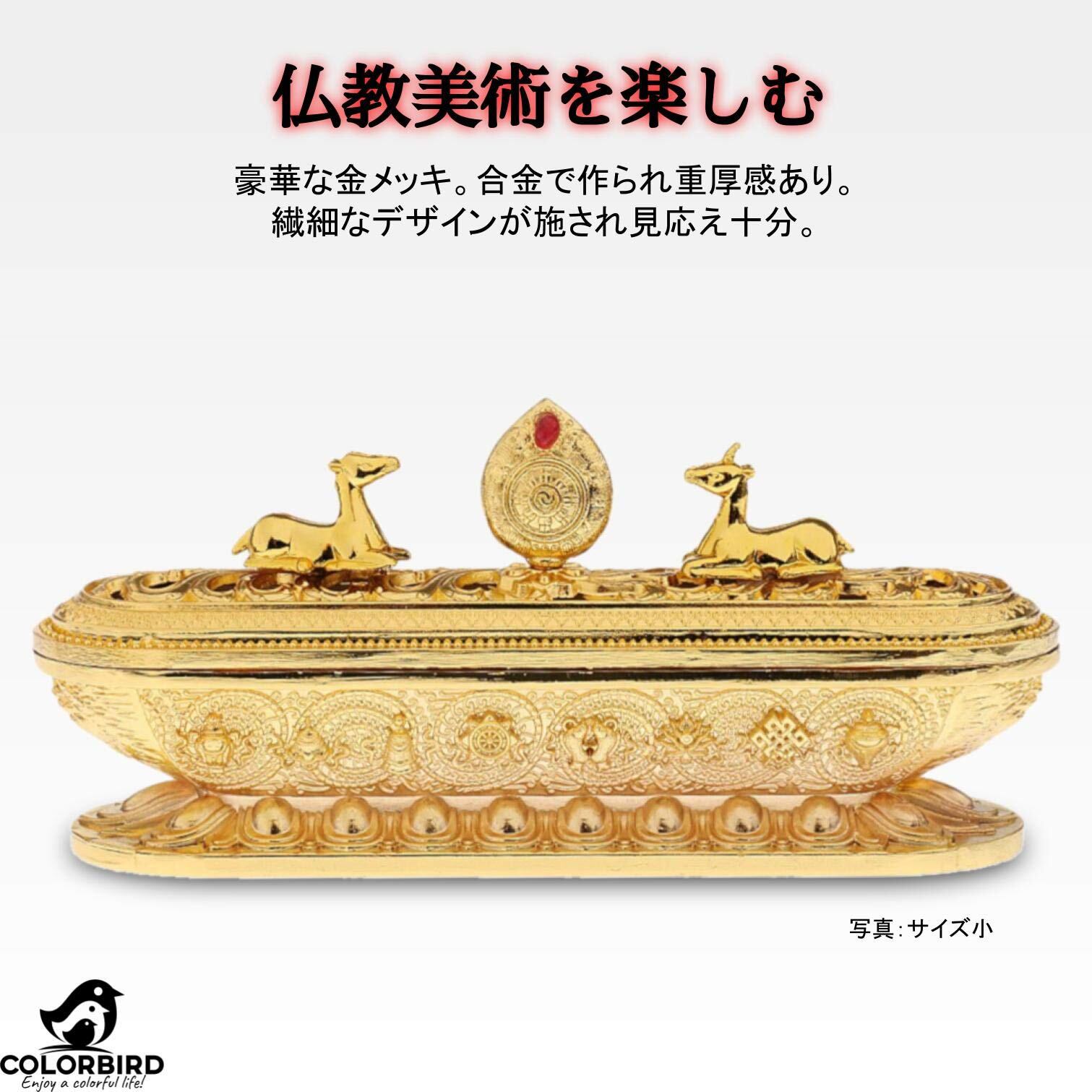 【特徴】スティックお香用の横置きタイプ。重厚かつ豪華な金メッキ。合金で作られ重厚感あり、落としても割れません。チベットで縁起の良い模様と八吉祥の紋様、六字真言が施されています。蓋にはチベット寺院の鹿野苑と法輪モチーフ付きです。中に線香を横置きする台座が入っています。