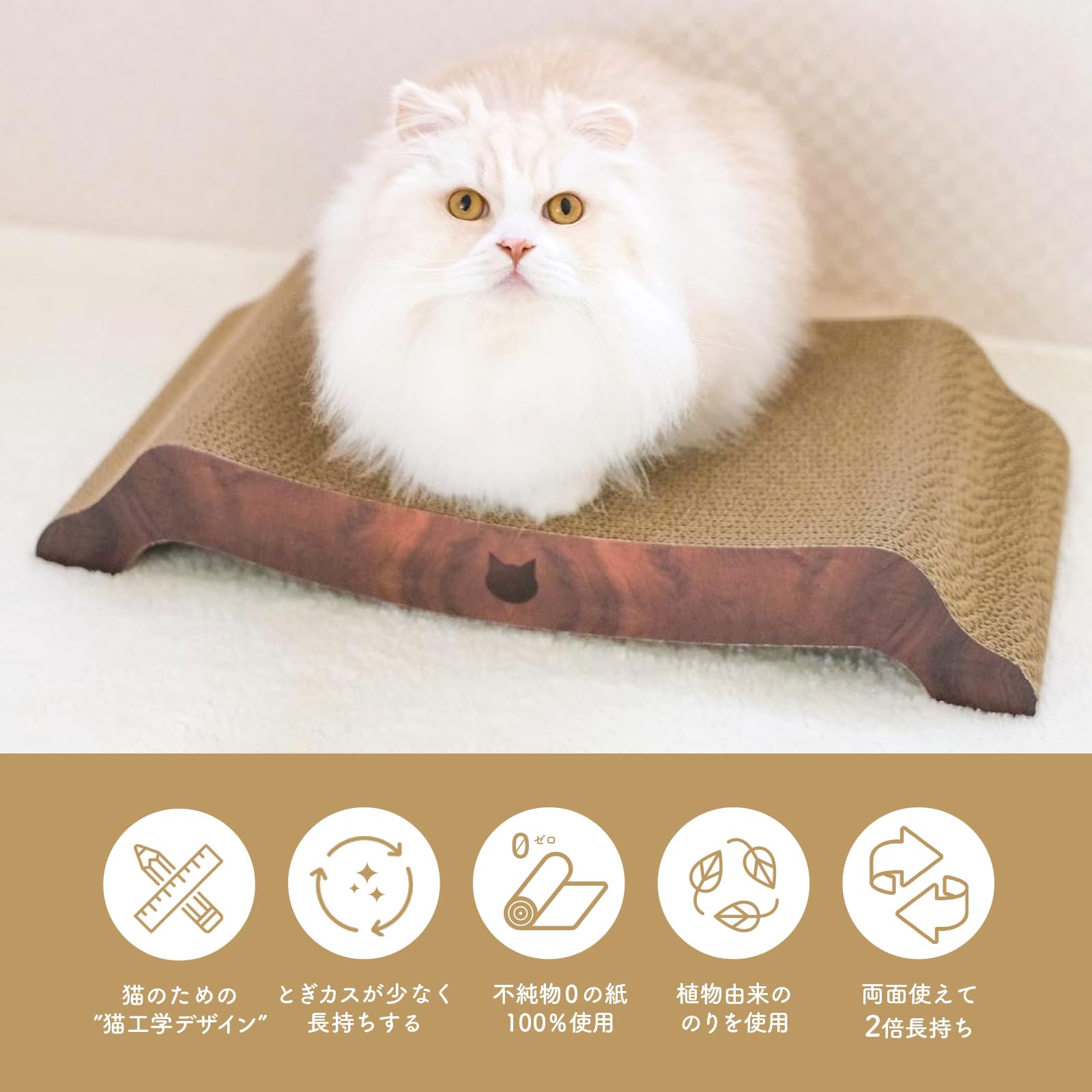 【こだわり抜いた原材料】つめとぎ部分に使用しているダンボールは、原料の100%が紙です。内10%はニュージーランド産原パルプ紙を使用。大切な猫に使用するつめとぎなので、品質にはとことんこだわりました。高品質なのでとぎカスもでづらくなっています。