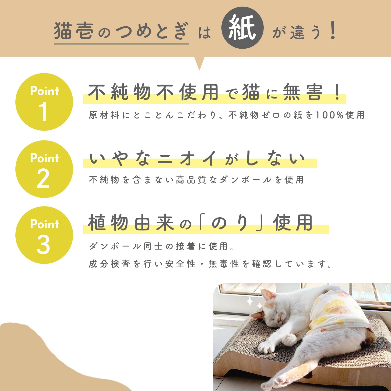 【天然素材の糊使用】猫がつめとぎをした後、手や肉球をなめても心配がないよう、ダンボールを貼り合わせる際に使用している糊は、とうもろこしを主原料とした天然素材の糊を使用しています。