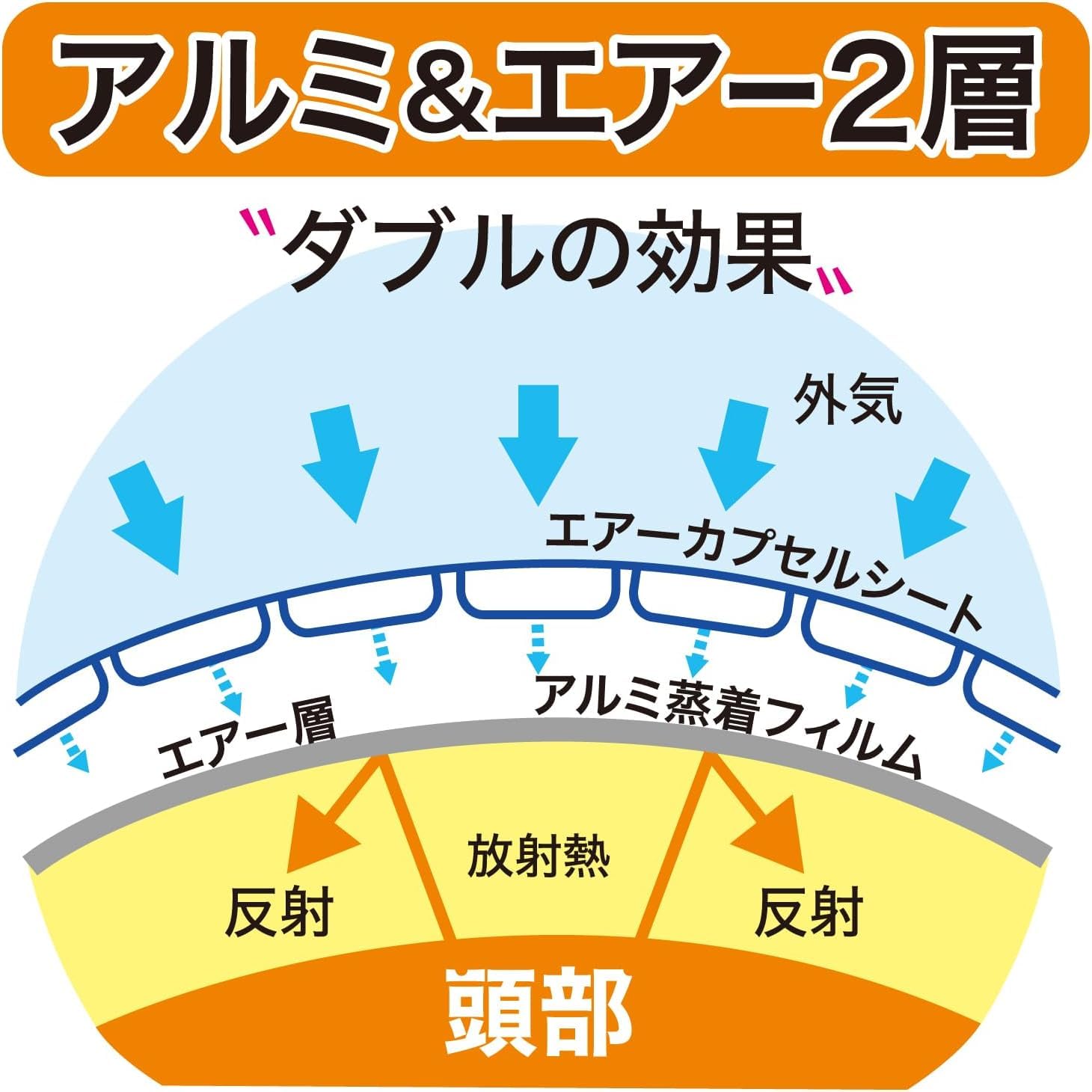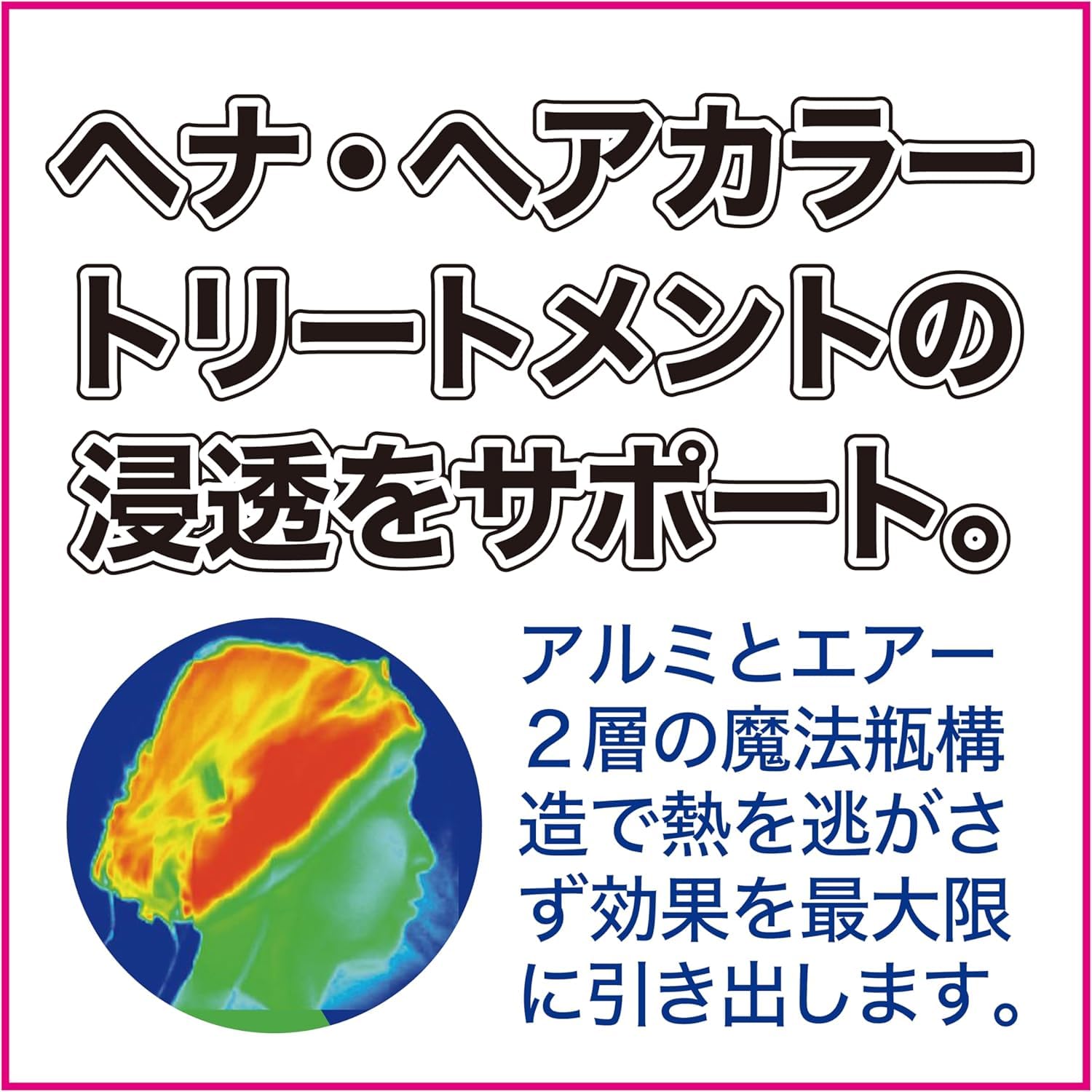 2、保温することでヘアカラーの色素は髪表面のキューティクルに定着し、染料の浸透が促進・色持ちも良くなります。頭皮から出る体温の放射熱を内側のアルミ蒸着フィルムによりキャップ内部に反射させ、外側のエアー層により外気を遮断することで効率的に保温効果を高めます。