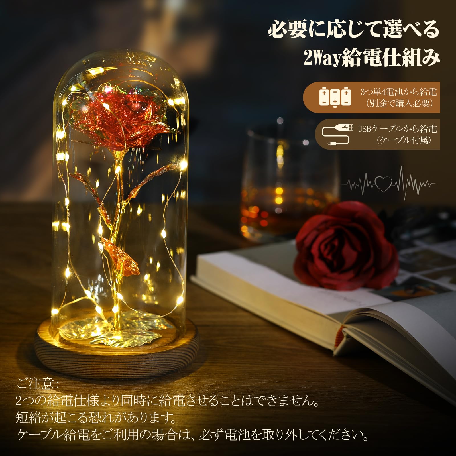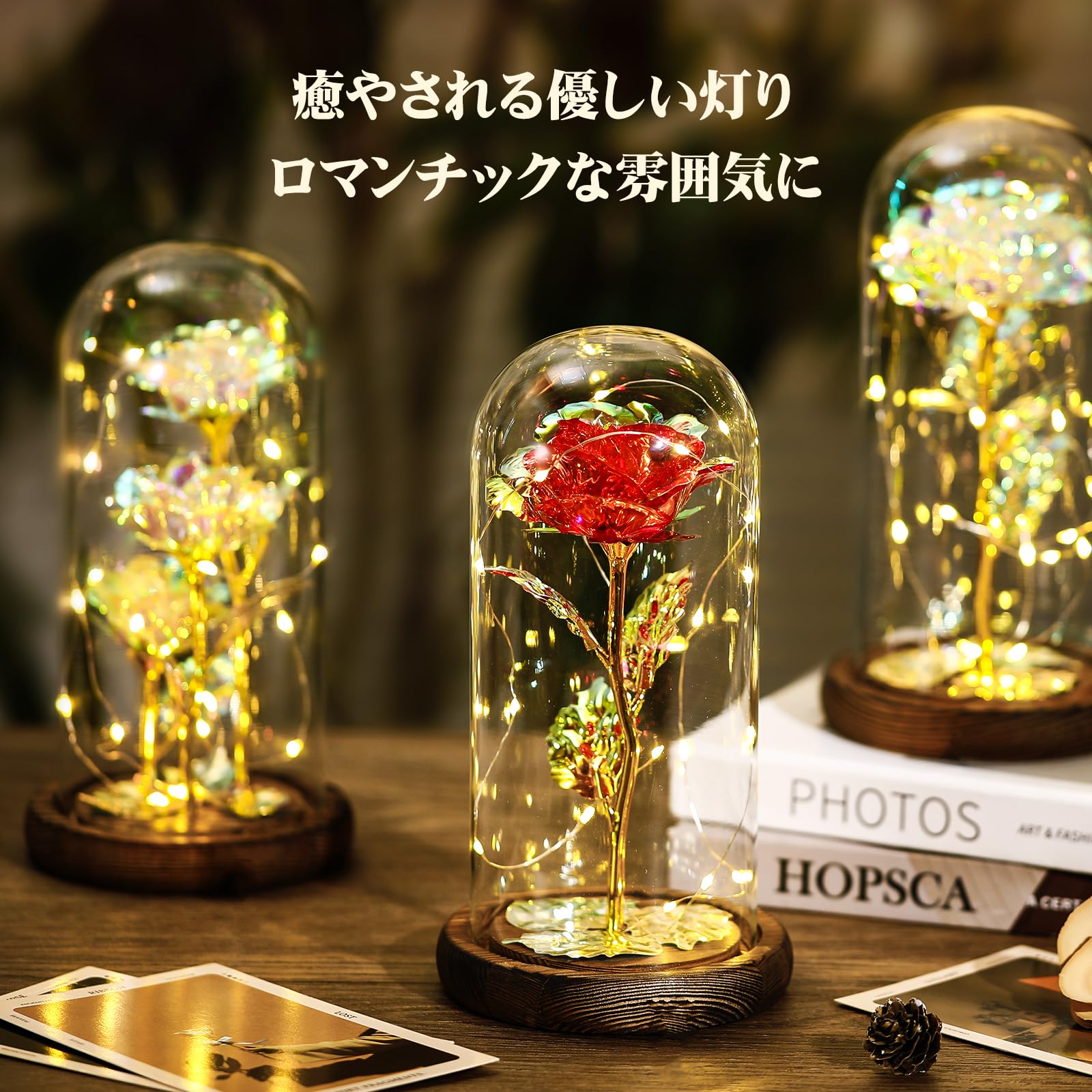 「キラキラLEDライト付き」3個単4電池で稼働させるローズをより美しく見せるストリングLEDライトが付いてあり、明るくキラキラ発光してくれて、発熱もほとんどありません。暖かい光が優しく温かく、ロマンチックな雰囲気を作り出してくれます。