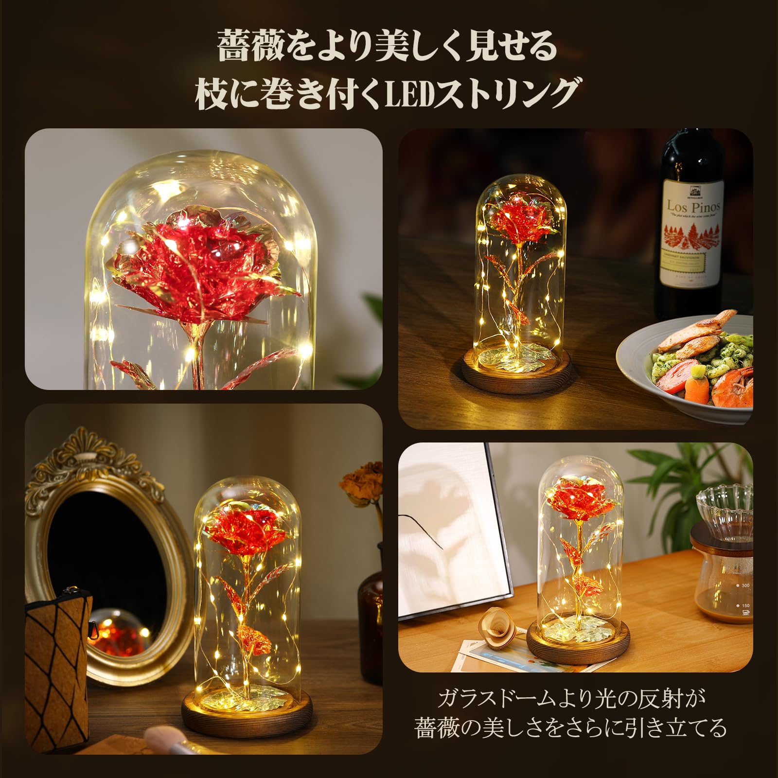 Lewondr バラ 造花 ガラスドーム 枯れない花 メッキローズ バレンタイン飾り 長持ち LEDライト付き 部屋飾り インテリア 引越しバラ/母の日/記念日/誕生日/入学/卒業/お祝い/お見舞い/お礼/彼女 クリスマス 飾り クリスマスライト ボックス付き 紅1輪