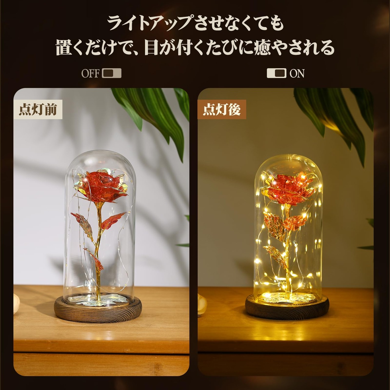 【在庫処分】Lewondr バラ 造花 ガラスドーム 枯れない花 メッキローズ バレンタイン飾り 長持ち LEDライト付き 部屋飾り インテリア 引越しバラ/母の日/記念日/誕生日/入学/卒業/お祝い/お見舞い/お礼/彼女 クリスマス 飾り クリスマスライト ボックス付き 紅1輪 | GIGATERA