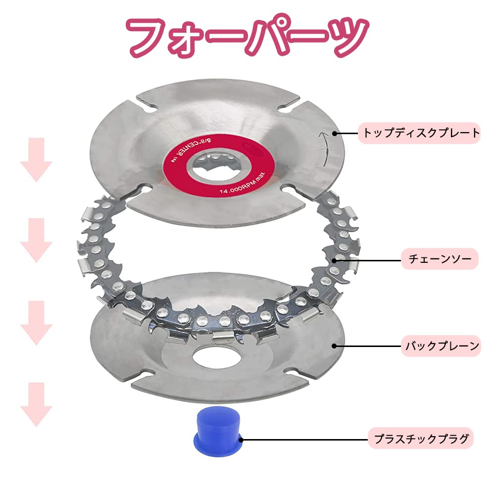 【商品特徴】削盤の円盤チェーンソーは、その速度と機動性を利用して、木材、プラスチック、氷、ハードゴムのカット、除去と彫刻を完成します。チェーンブロックは2つの鋼板の間に固定されていて、これはしっかりと握って、テクスチャや結び目にかかわらず、素材を簡単にカットすることができます。