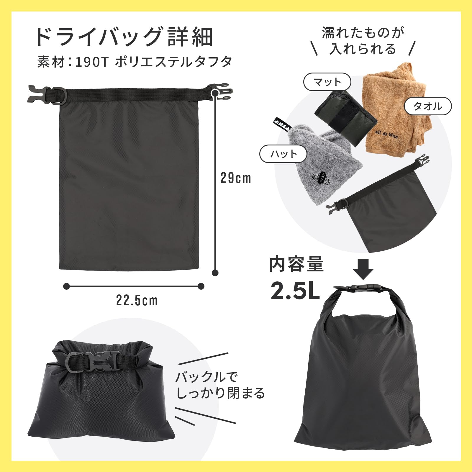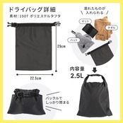・2.5Lのドライバッグは濡れたもの入れに。量に応じて一回や二回口を折ってバックルを止めれば防水!