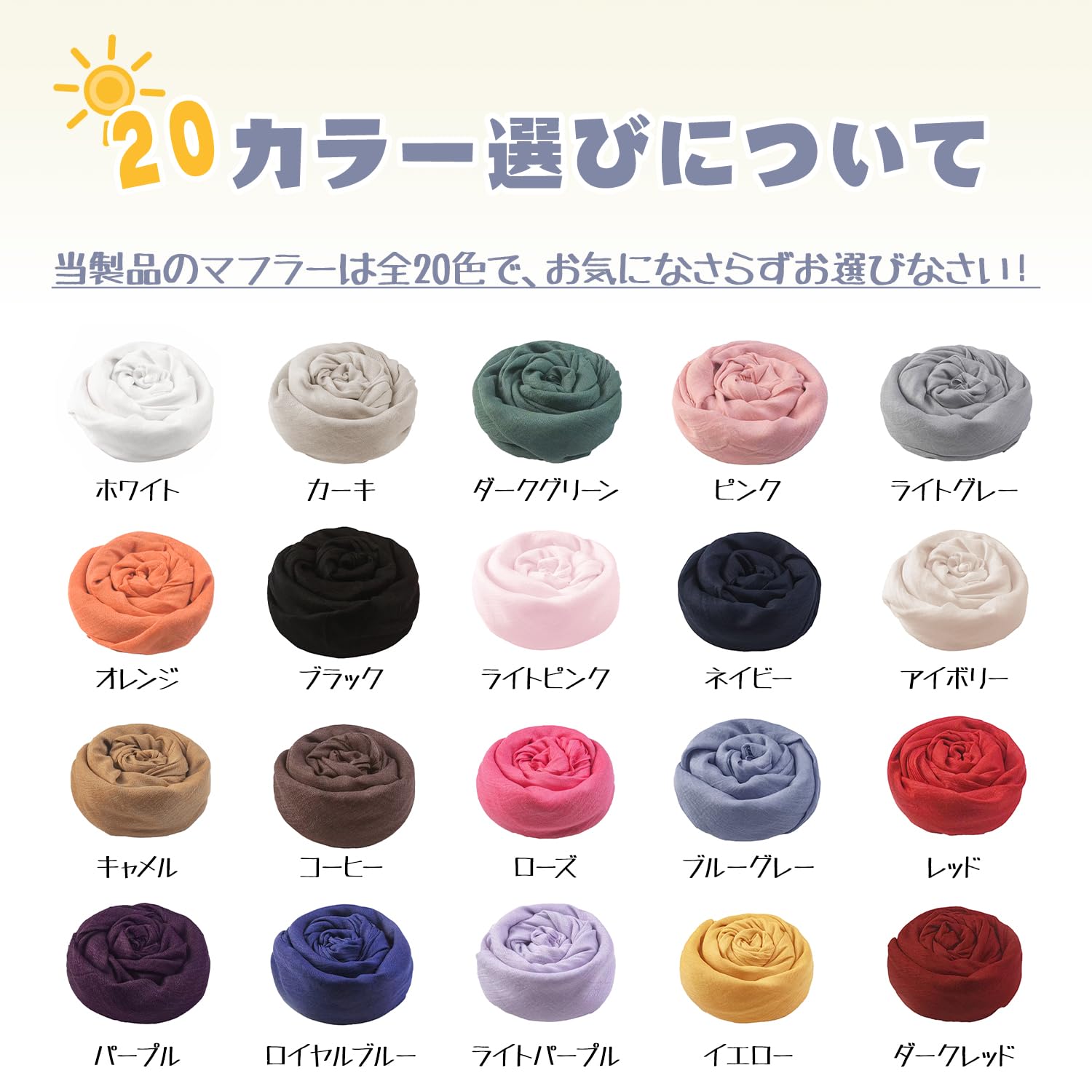 【ガーゼ マフラー】:サイズ:192*100cm,カラー:ホワイト、カーキ、ダークグリーン、ピンク、ライトグレー、オレンジ、ブラック、ライトピンク、ネイビー、アイボリー、キャメル、コーヒー、ローズ、ブルーグレー、レッド、パープル、ロイヤルブルー、ライトパープル、イエロー、ダークレッド。当製品のマフラーは全20色で、お気になさらずお選びなさい!