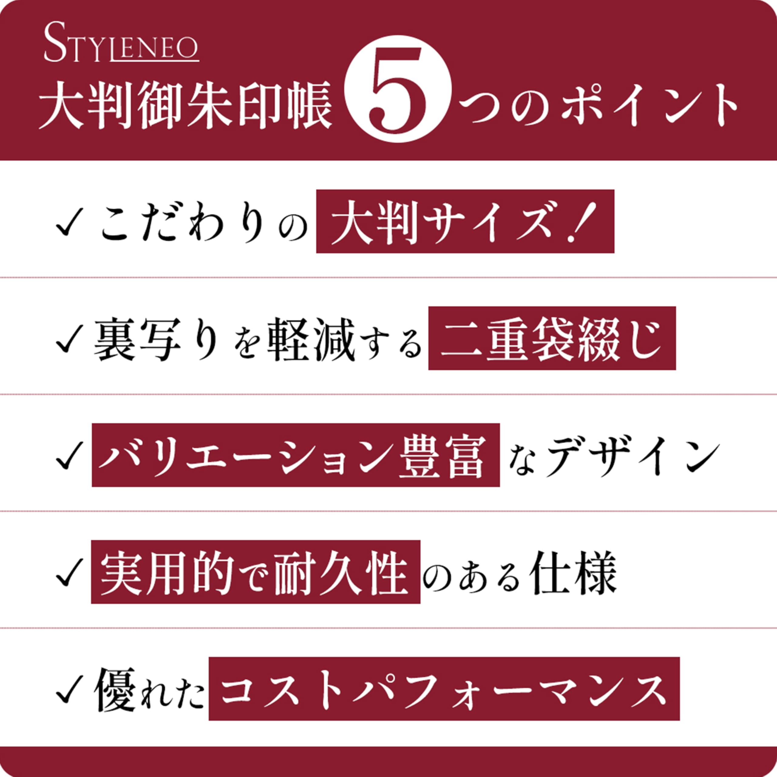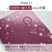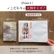 【こんなお悩みを解決します】 「書き置きの御朱印が大きくて、今までの帳面にはみ出てしまう…」 → 【大判サイズ】で、さまざまなサイズの御朱印にゆとりを持って対応。貼るのもすっきりです。 「墨が裏ににじんで、他のページが汚れてしまわないか心配…」 → 【裏写りしにくい二重構造】が、墨のにじみを軽減。大切な御朱印を美しい状態で保管できます。 「御朱印帳を持ち歩くので、汚れや摩擦が気になる…」 → 【高級感のある光沢コーティング】が、表紙を保護。日常の持ち運びにも強い耐久性を発揮します。 「パッと開いて、集めた御朱印を一度に眺めたい!」 → 【蛇腹式設計】で、ページをめくる手間なく、すべての思い出を一望できます。