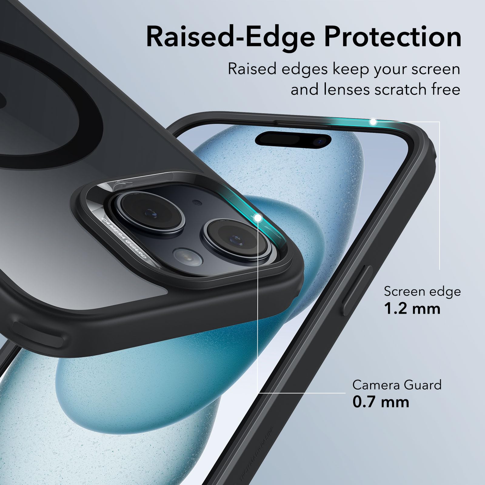 【隆起したエッジ保護】隆起した画面エッジとカメラガードレンズフレームにより、保護性が強化され、大事な部分を傷から保護します。