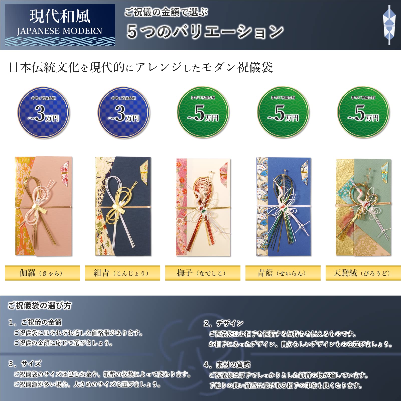 【迷わない】結婚式のご祝儀袋を「デザイン(シリーズ)」と「ご祝儀金額」で迷わず簡単に選べるようになっています。