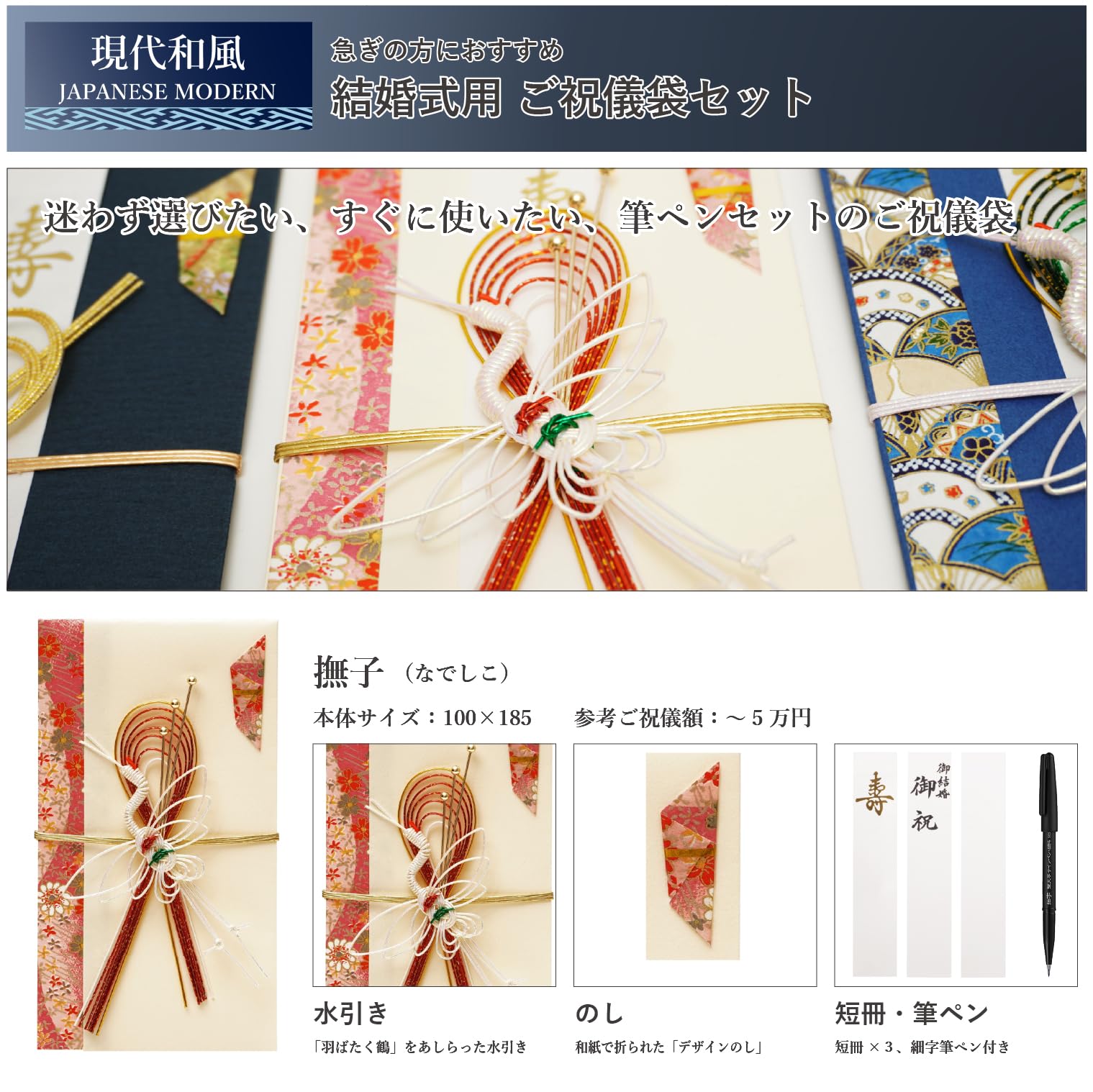 すぐに使える 筆ペン付きご祝儀袋 「現代和風」 和モダン ご祝儀袋 結婚式 のし袋 水引 内袋 短冊 筆ペン |〜5万円用 撫子(なでしこ)