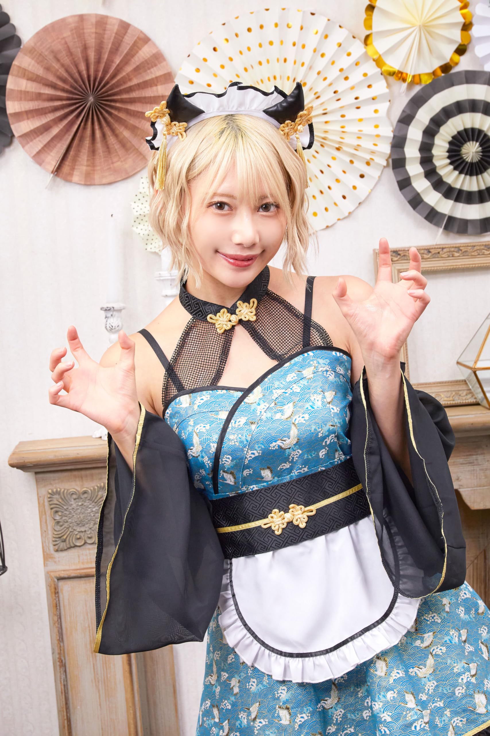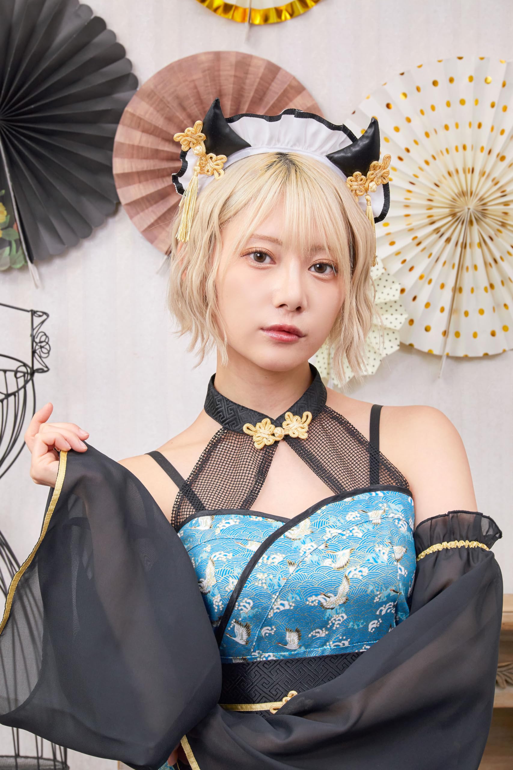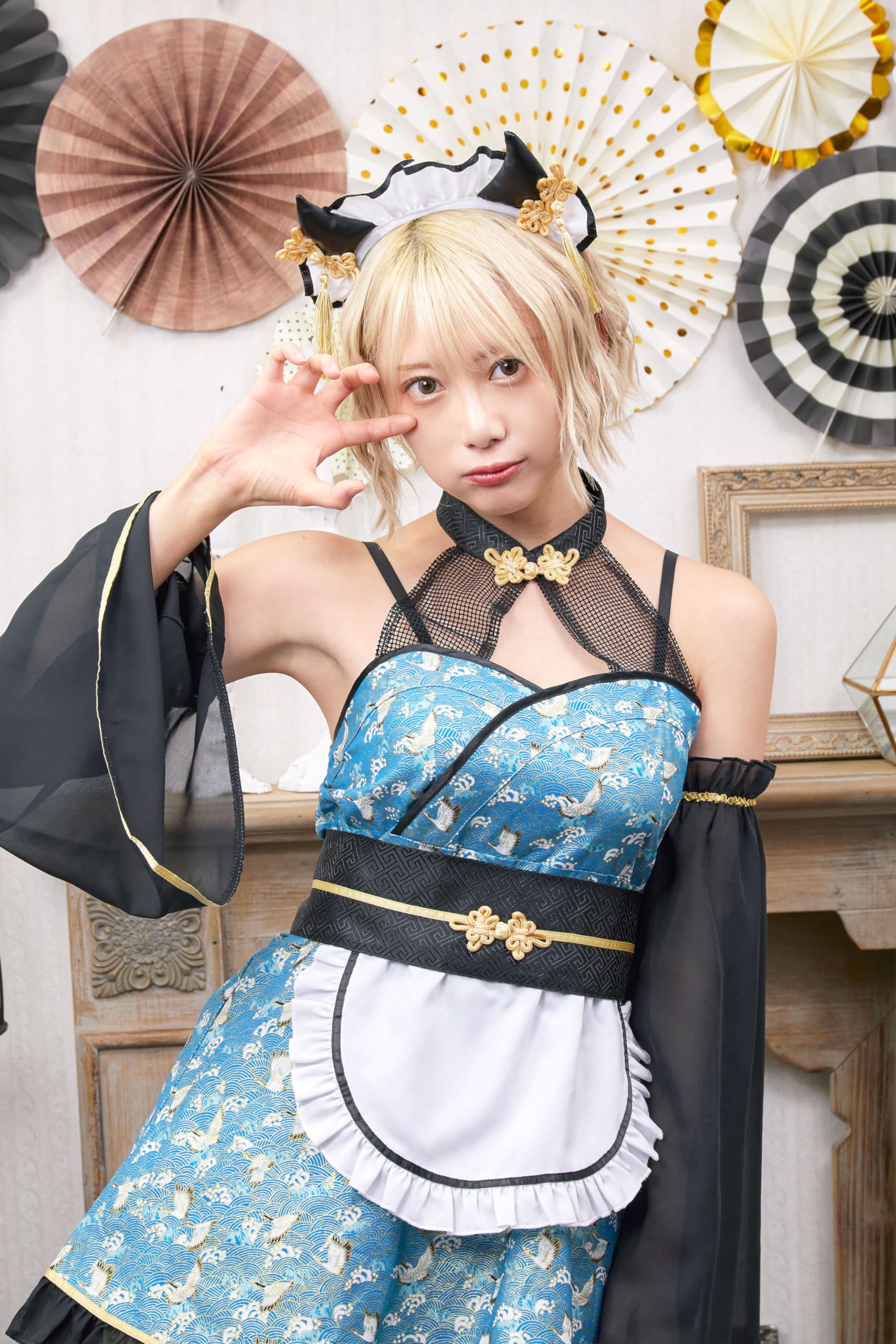大きめのツノとタッセルが付いたメイドカチューシャで顔周りが映えます。