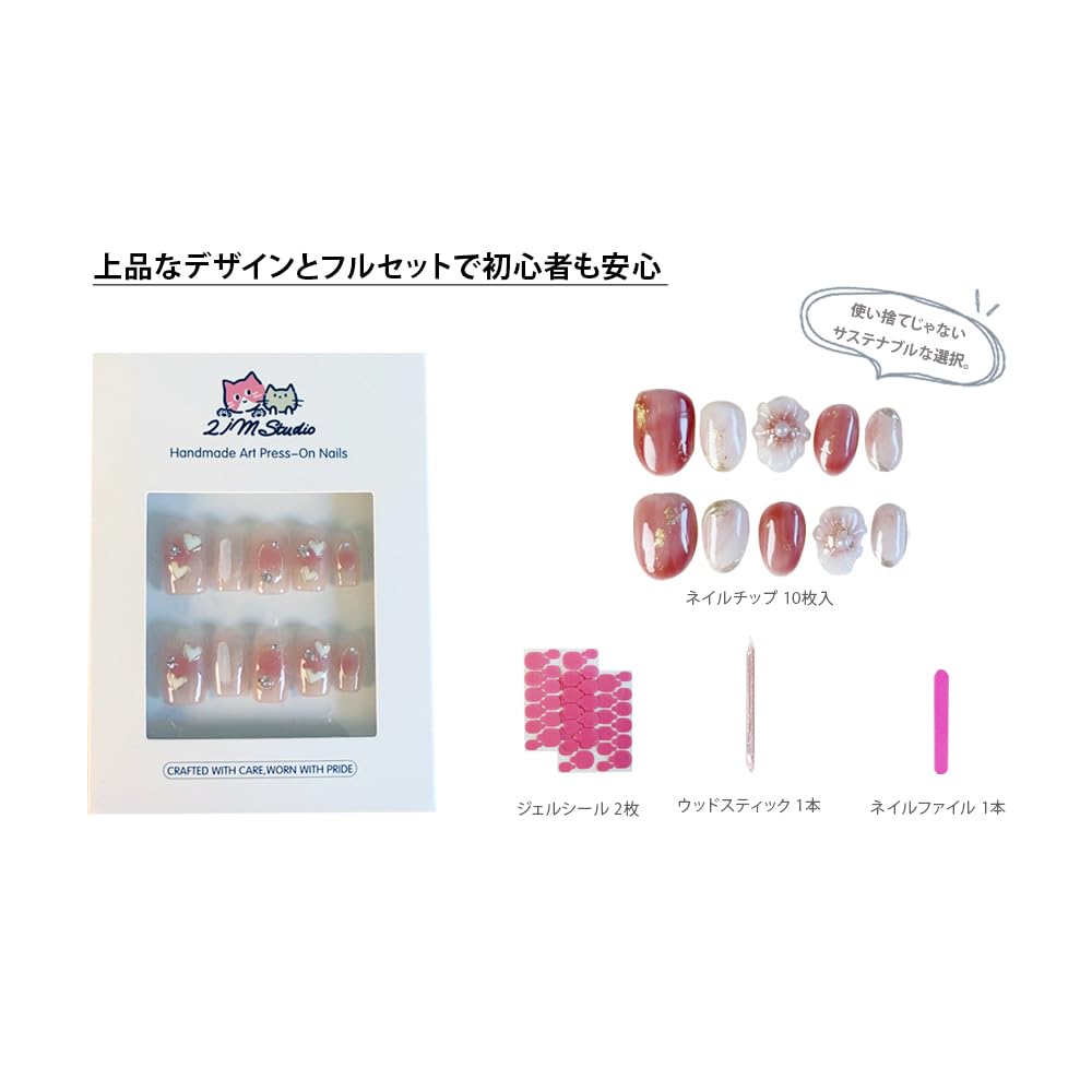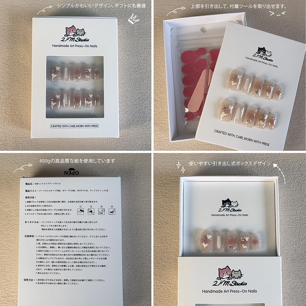 ??「ネイルサロンレベルのセット、サイズ選びも重要」 セット内容:ネイルチップ10枚、ジェルシール2枚、ネイルファイル1本、ウッドスティック1本。 【ご注意事項】 ご購入前にサイズをご確認の上、最適なフィット感を確保し、快適で自然な装着感をお楽しみください。 それぞれ手作りのため、実物と写真には若干の違いがございますので、ご了承ください。 ジェルパッドとツールセットはパッケージの底に収納してありますので、ご確認ください。