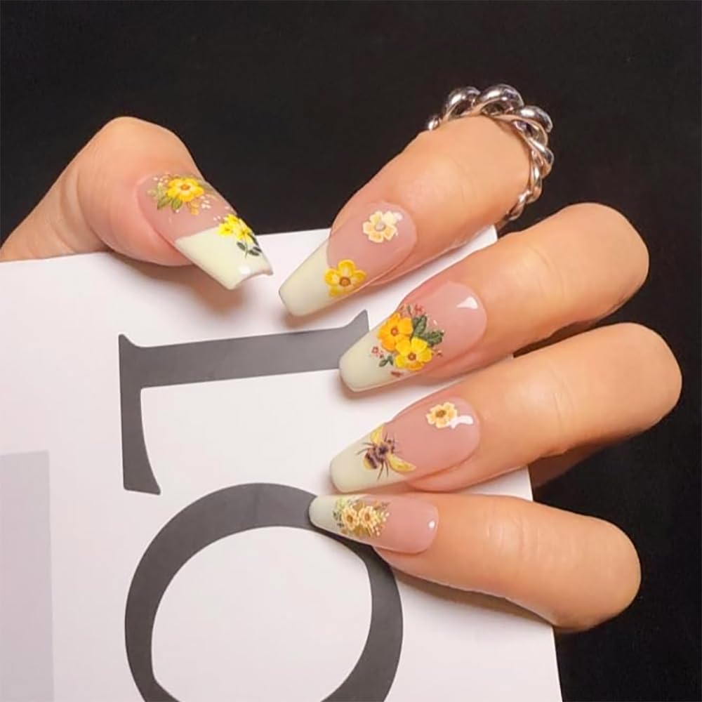ネイルチップ 10枚入 職人仕上げ 和風ミニマルデザイン 上品シンプル フラワーアート 桜 花びら 手作りサロン級 フォトウェディング 結婚式 成人式 オフィスネイル 卒業写真 デート ショッピング パーティー 高級レストラン 両面テープ・木棒・爪やすり付き 人気つけ爪 (ひまわり M)
