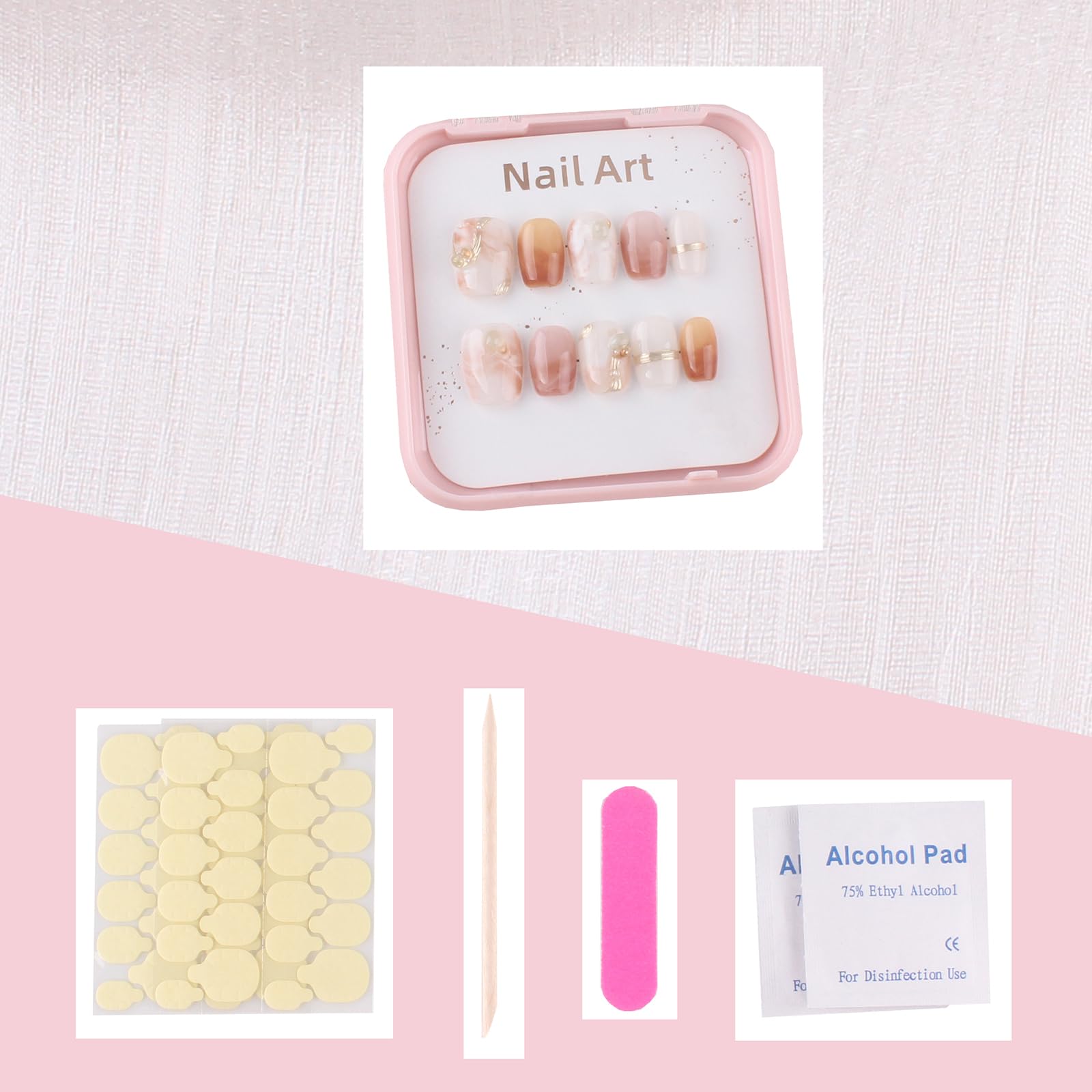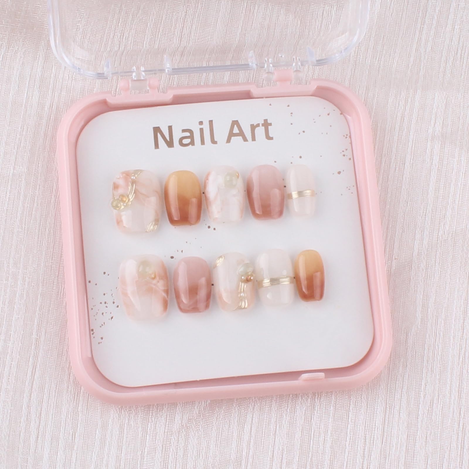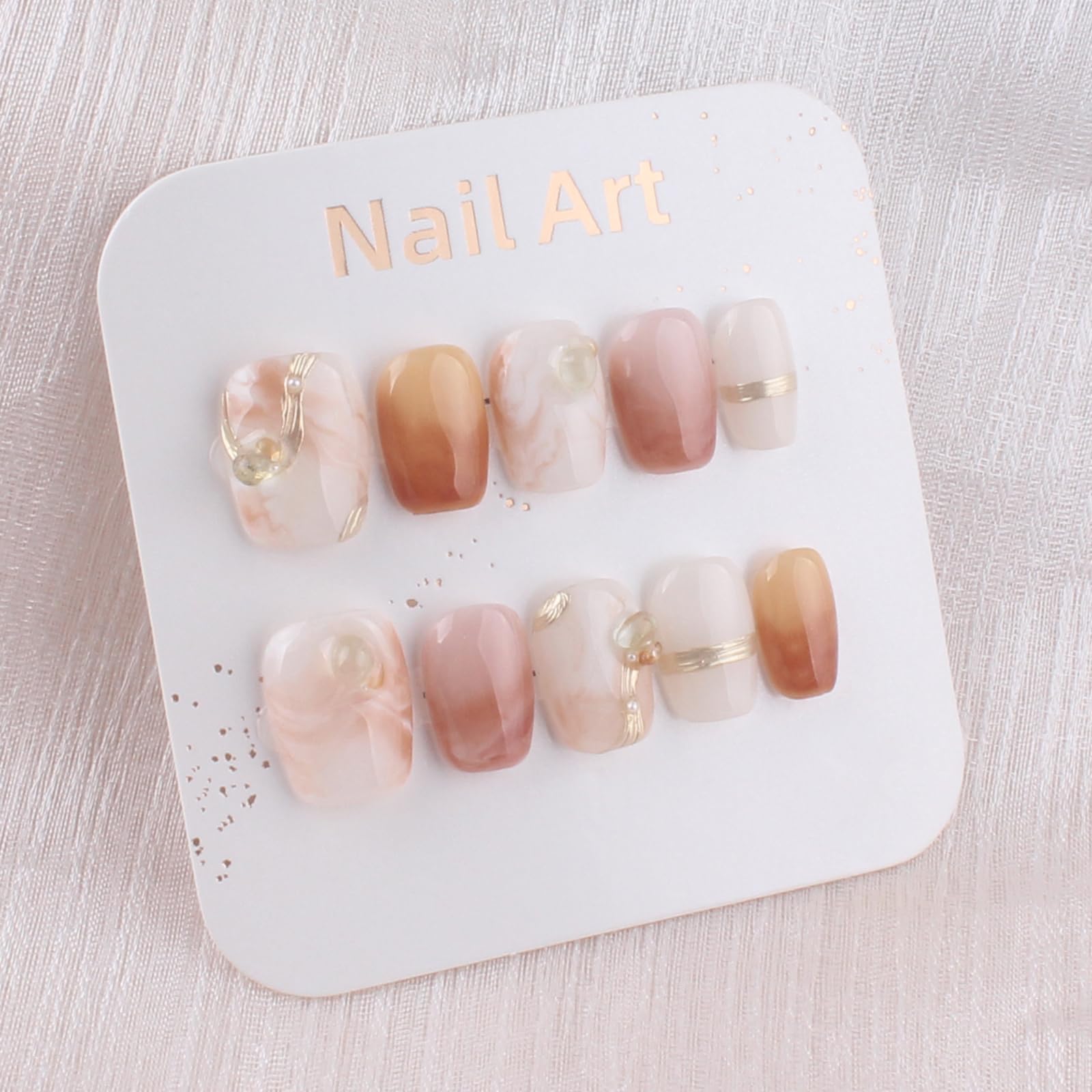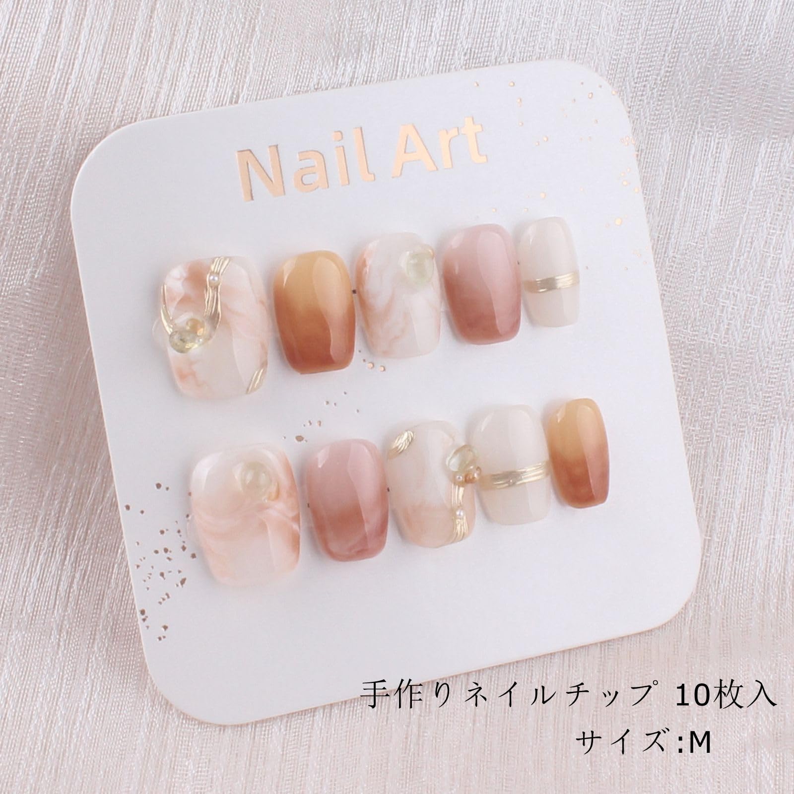MZCMSL 手作り ネイルチップ ショート 短め スクエア 茶色 金 白 マーブル 立体 キラキラ 3D おしゃれ 可愛い デザイン つけ爪 付け爪 収納ボックス付き 10枚入 M