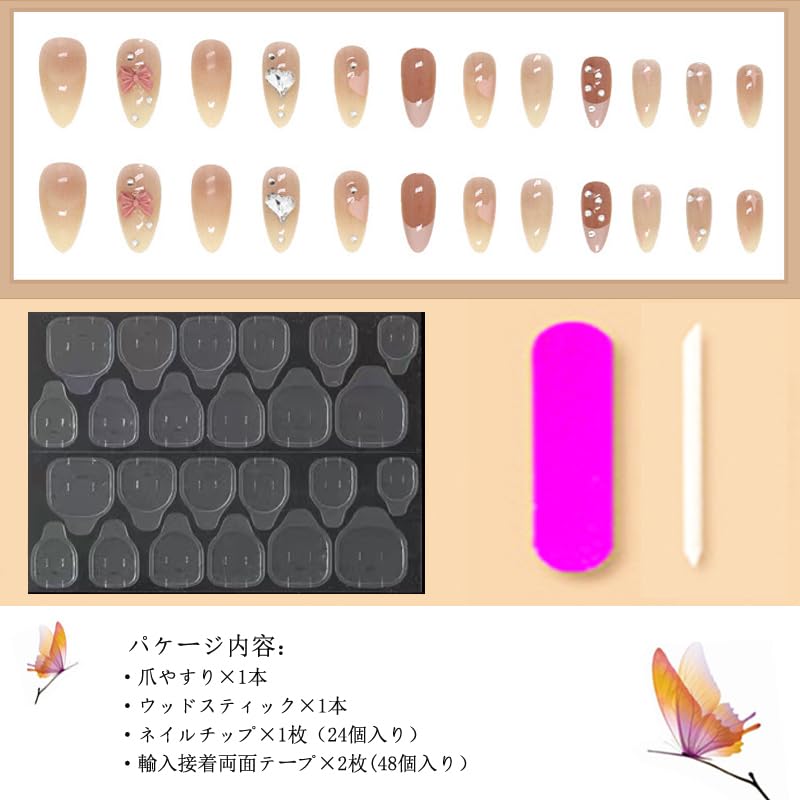 【届いたらすぐに使用できる】ネイルチップ(24枚・12別サイズ)/両面テープ2枚(48個)/爪やすり1本/木の棒1本など含んで、届いたらすぐに使用ができて、5-10分ぐらいはやく完成します。ネイルサロンに行くことが必要なく、お自宅で気軽的に綺麗なネイルが出来て、初心者でもお簡単に完成られます。