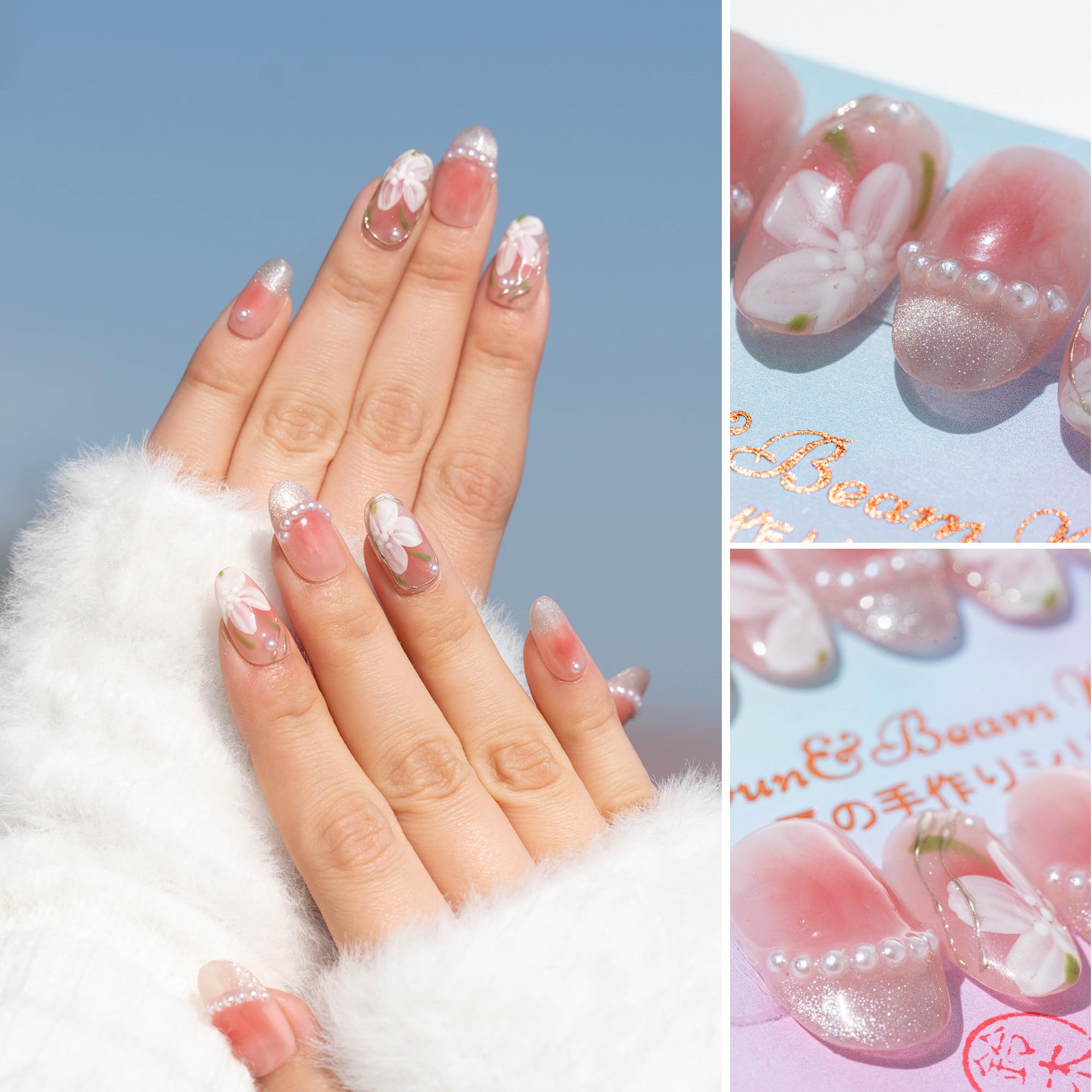 Sun&Beam Nails 手作り ネイルチップ ミディアム オーバル 人気 3d マグネット デザイン ピンク パール 椿 ファッション 可愛い 和柄 収納ボックス付き 10枚入 (#01 木槿・ピンク ・ M)