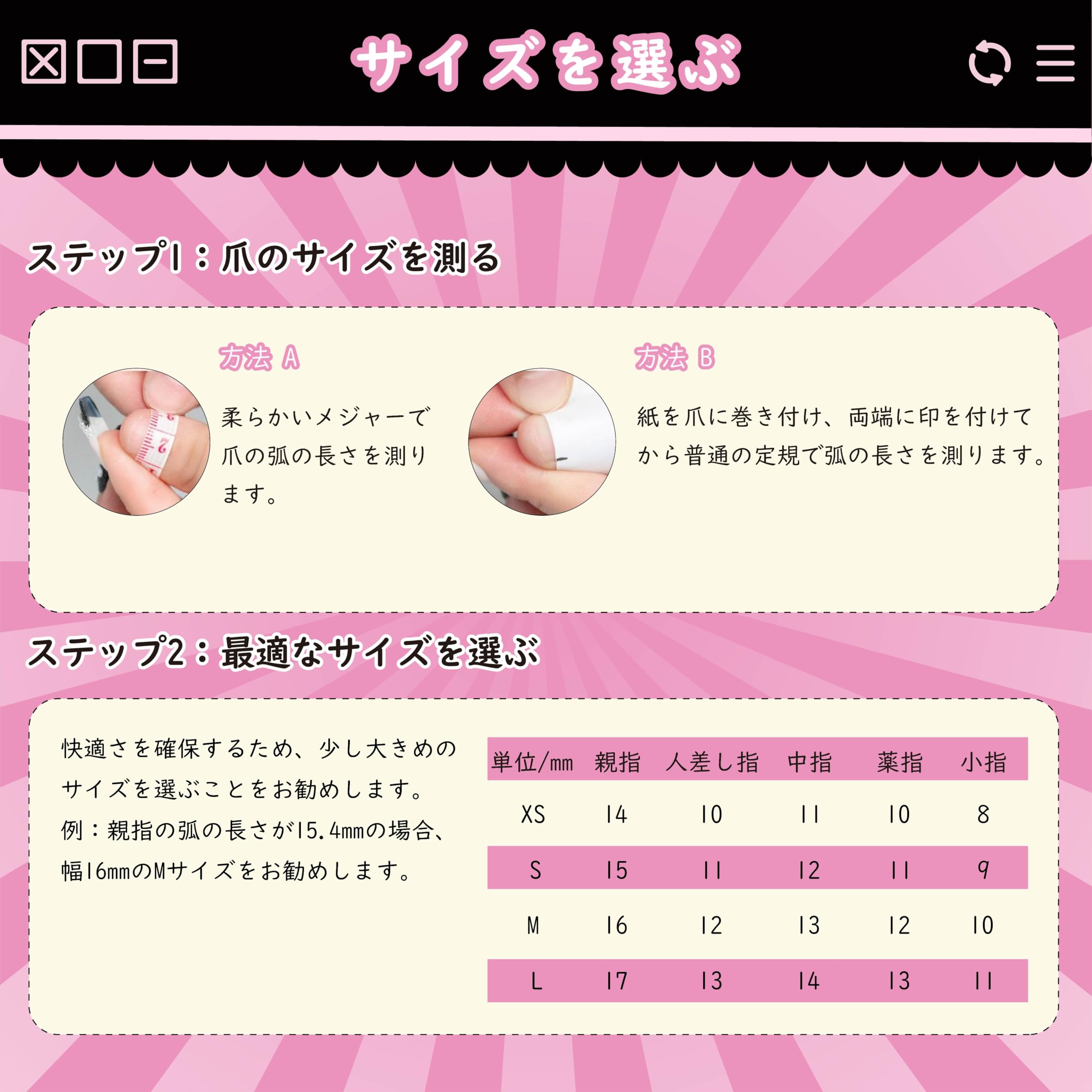 ??【パッケージ仕様】 ネイルチップ 10枚、爪用両面テープ24枚、ネイルリムーバースティック1本、爪やすり1個、マニキュアスティック1本も付きます!※サイズの測定方法と選択方法については、製品画像を参照してください。※最良の結果と再利用性のために、下記で推奨されているジェリーグルーを使用することをお勧めします。