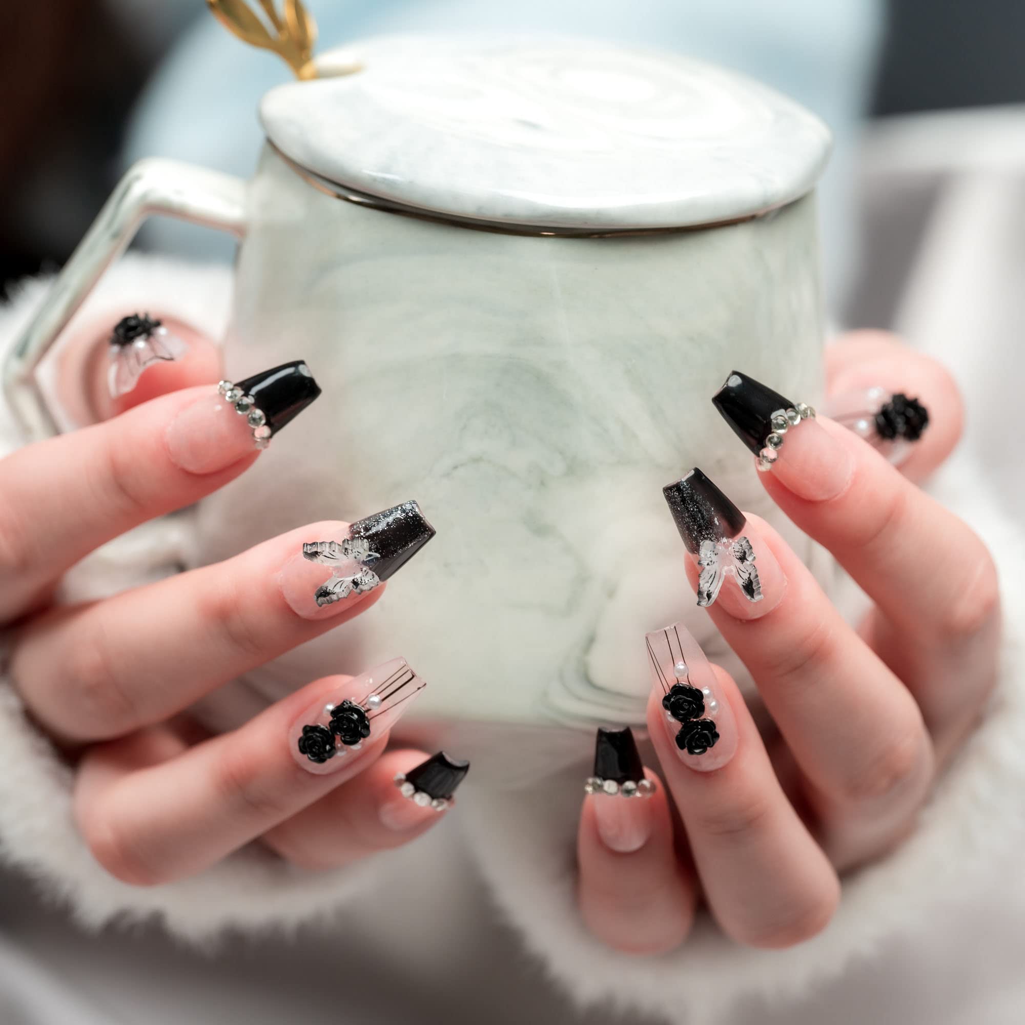 Sun&Beam Nails 手作り ネイルチップ ミディアム ロング バレリーナ 青 ブルー 黒 人気 3D おしゃれ 可愛い デザイン つけ爪 付け爪 10枚入 (#69 S)