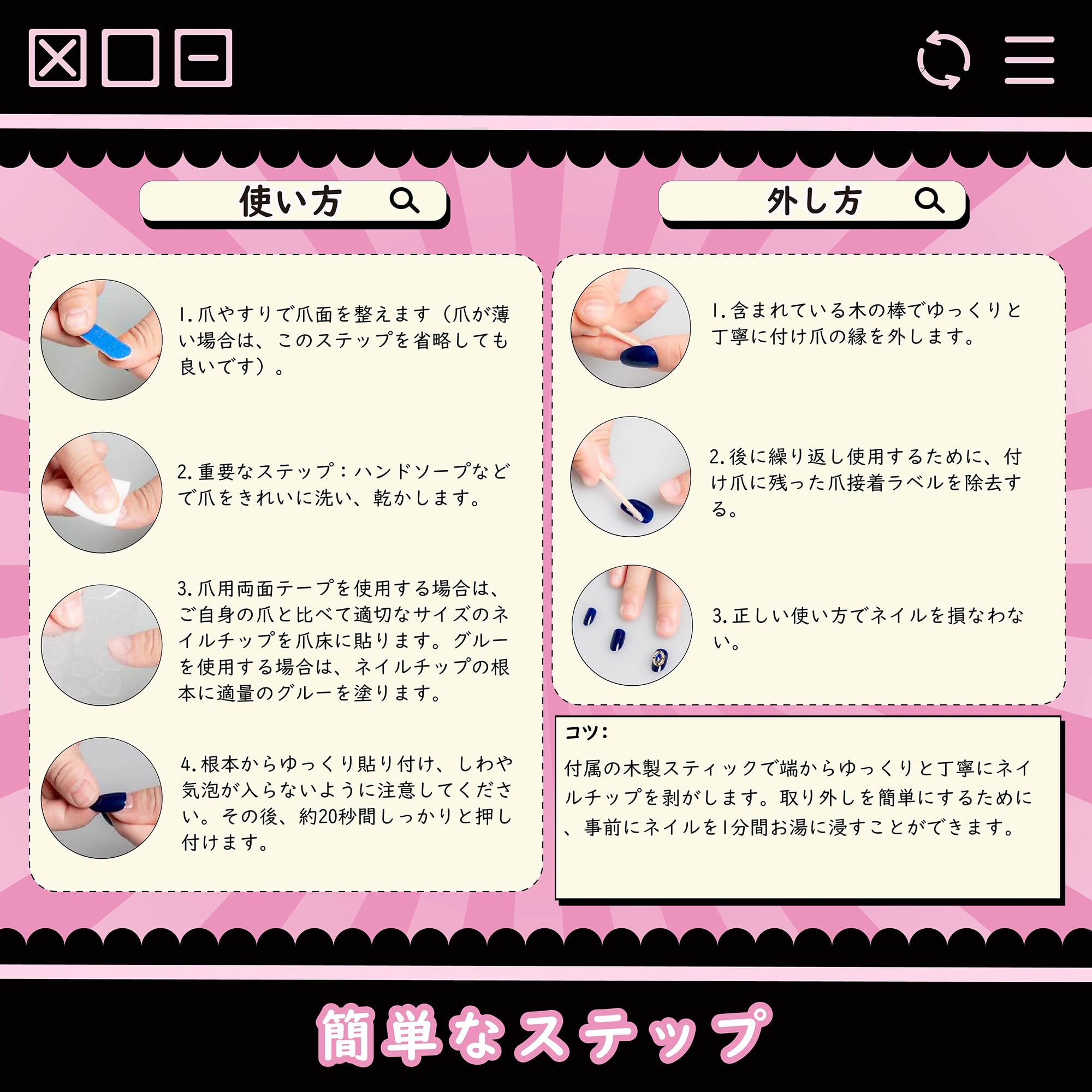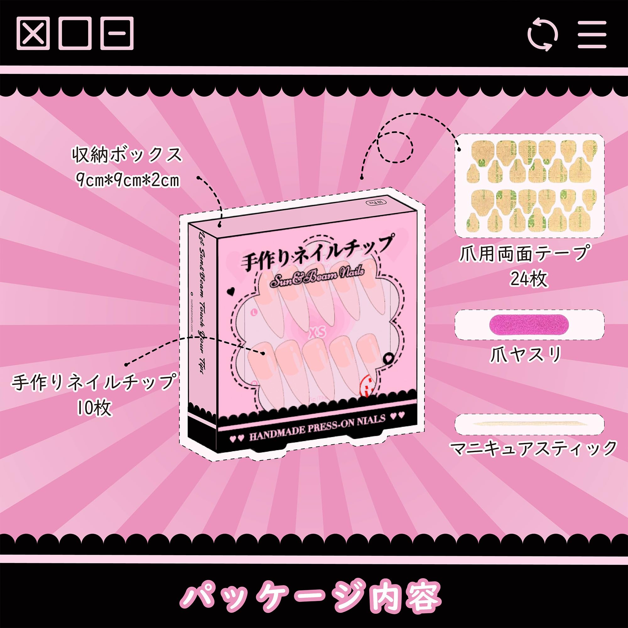 ??【内容】含まれているもの: 10枚のネイルチップ、24枚の爪用両面テープ、1つの爪やすり、1つの木製キューティクルスティック、1つの収納ボックス。※最高の結果と再利用性のためには、Sun&Beam Nailsが販売するジェリーグルーの使用を推奨します。