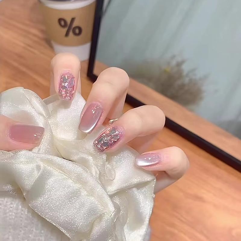 ネイルチップショート 人気ネイル 24枚入り ネイルチップ ロング春 夏 和風 かわいい ネイルチップ秋冬 手作りネイルチップグラデーション ネイル 花嫁 ショート 光沢 つけ爪 成人式 結婚式長め (オーロラピンク)