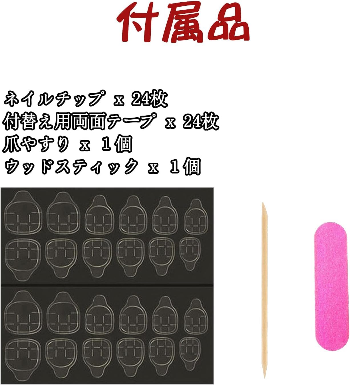 内容:ネイルチップ24枚+付替え用両面テープ24枚+爪やすり1個+ウッドスティック1個