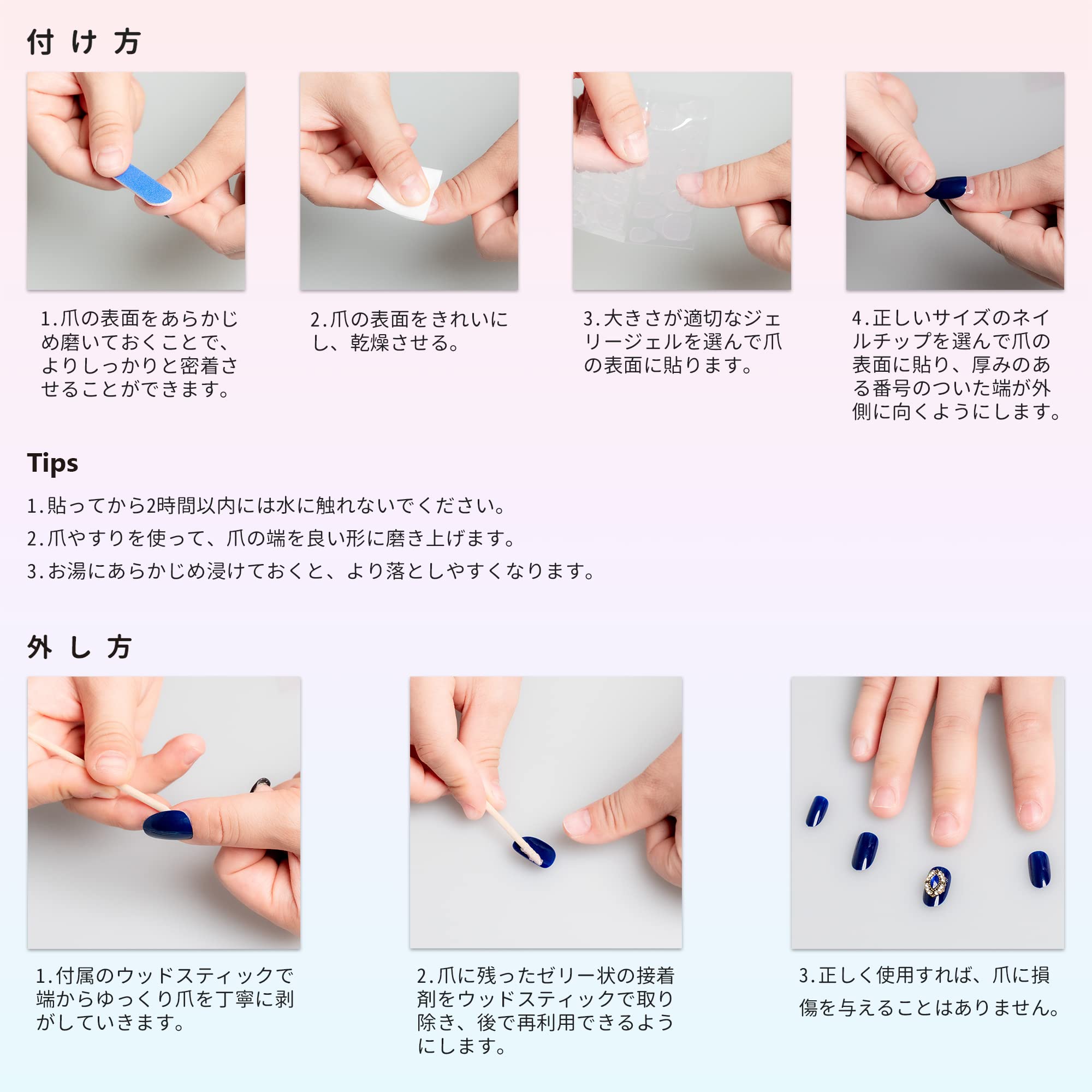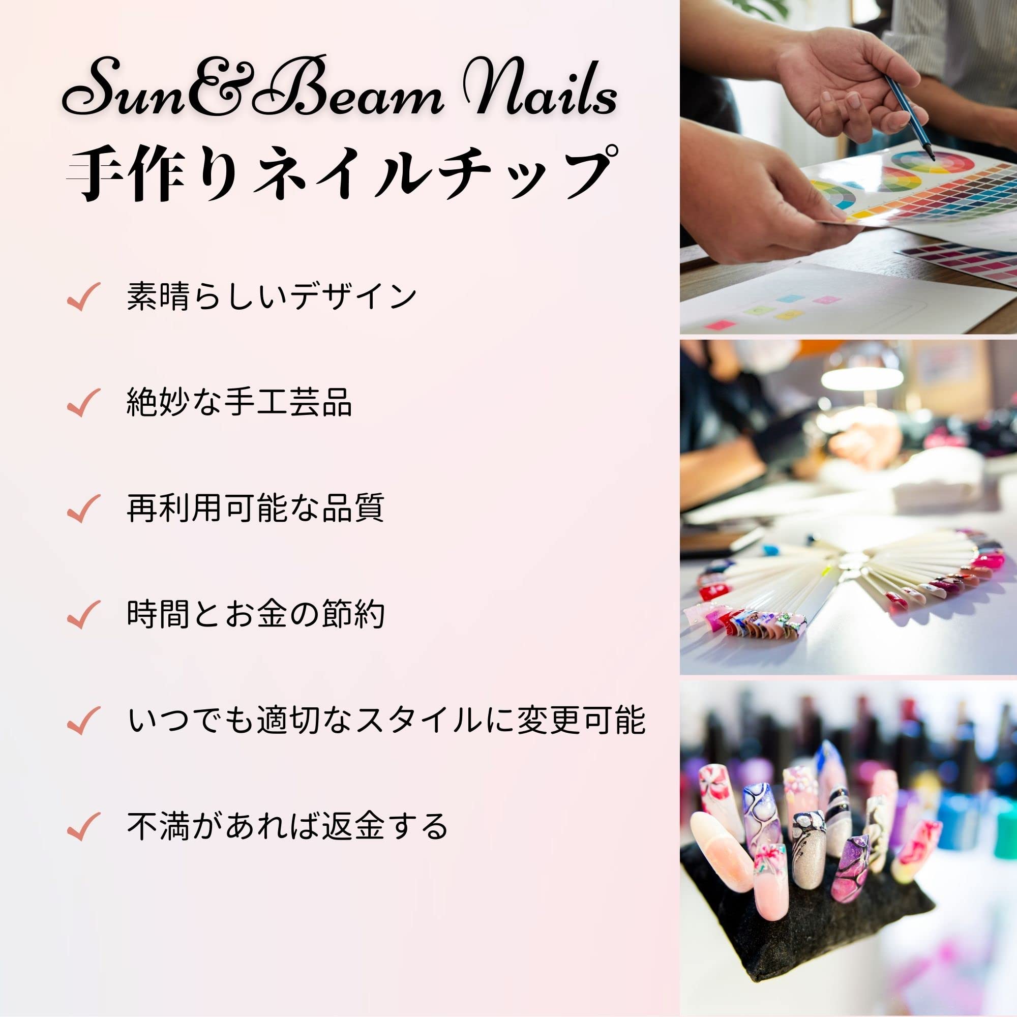 ??【内容】含まれているもの: 10枚のネイルチップ; 24枚の爪用両面テープ; 1つの爪やすり; 1つの木製キューティクルスティック; 1つの収納ボックス; ※最高の結果と再利用性のためには、Sun&Beam Nailsが販売するジェリーグルーの使用を推奨します。