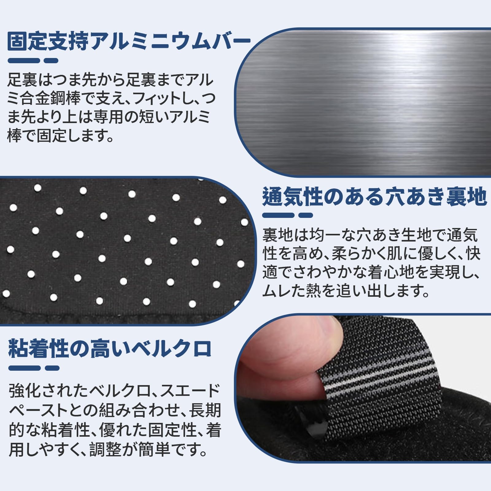 【製品の特徴】:二重のアルミニウムストリップ補強により固定効果が向上します。 強化されたベルクロとスエードの表面を採用し、長期的な接着力、良好な固定性、そして着用が簡単です。 左右どちらの足にも使用できるので片足の悩みも軽減され、ベルクロで締め具合も調整可能です。