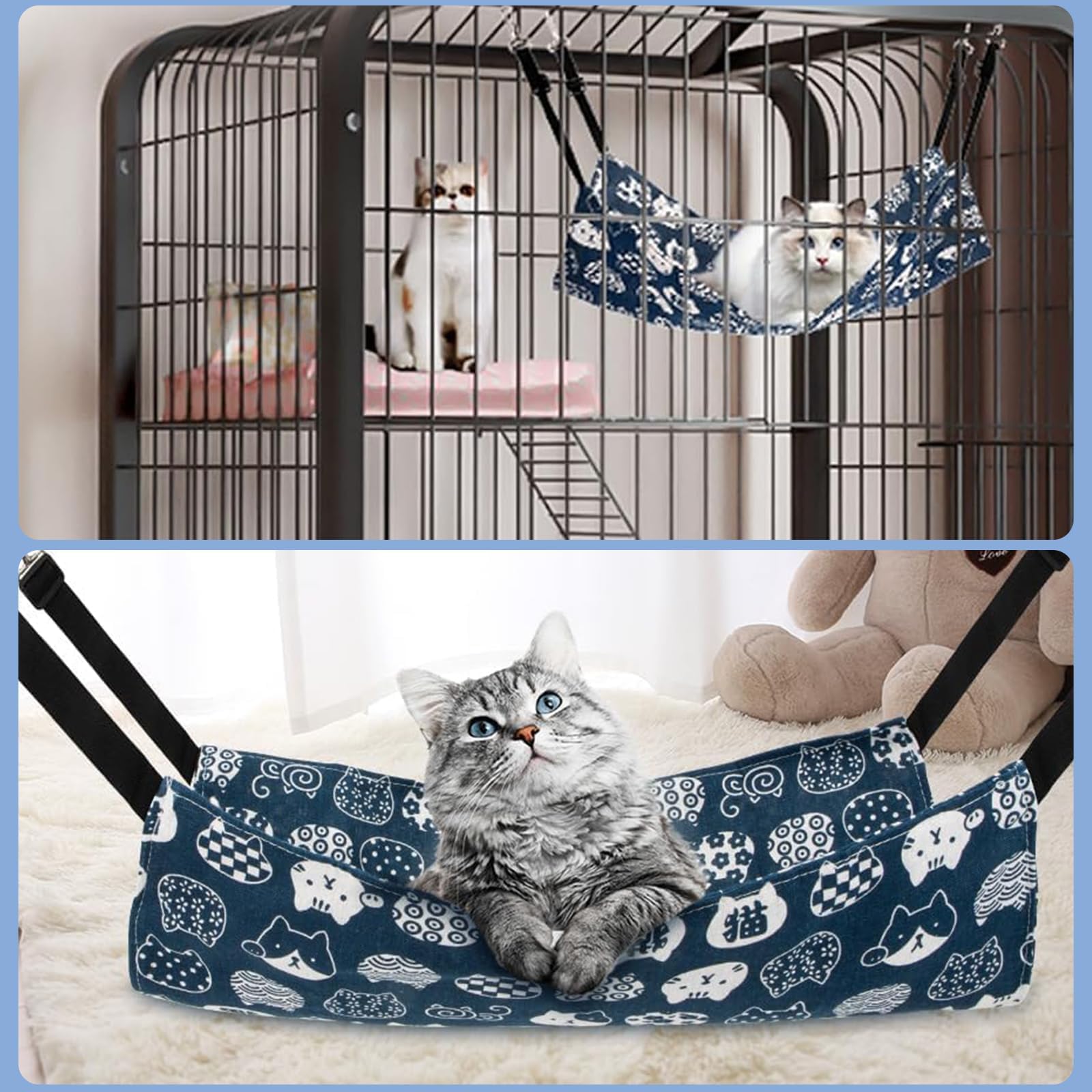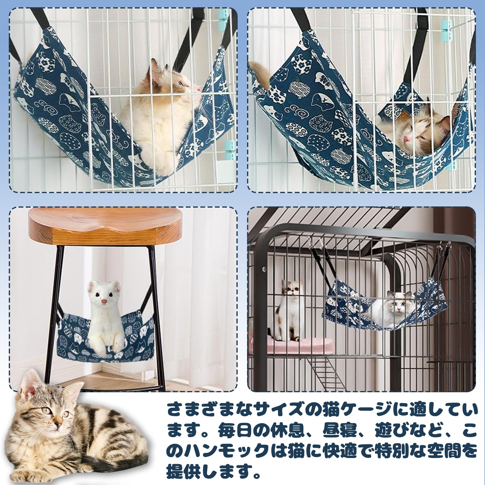猫 ハンモック 吊り下げベッド ケージ ゲージ用 ヒモ調整可能 耐荷重10KG サイズM 35cm x 35cm ペットベッド 猫用ハンモック 快適 通気性 洗濯可能 金具丈夫 春夏両用 猫はんもっくケージ用 (ブルー)