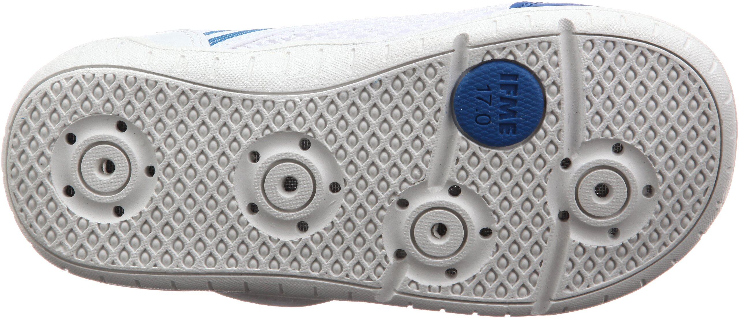 「息するソール」! 特殊加工のホールが足ムレを解消 するIFMEの上履き(特許番号:第5468059号)。アウトソールとインソールの両方に通気孔を設置。空気を循環させ、熱や湿気を外へ放出して足ムレを防止。アッパーに採用したダブルラッセルメッシュ素材と併せて足ムレを解消し、靴の中を快適に保ちます。しかもスペアインソール付き!