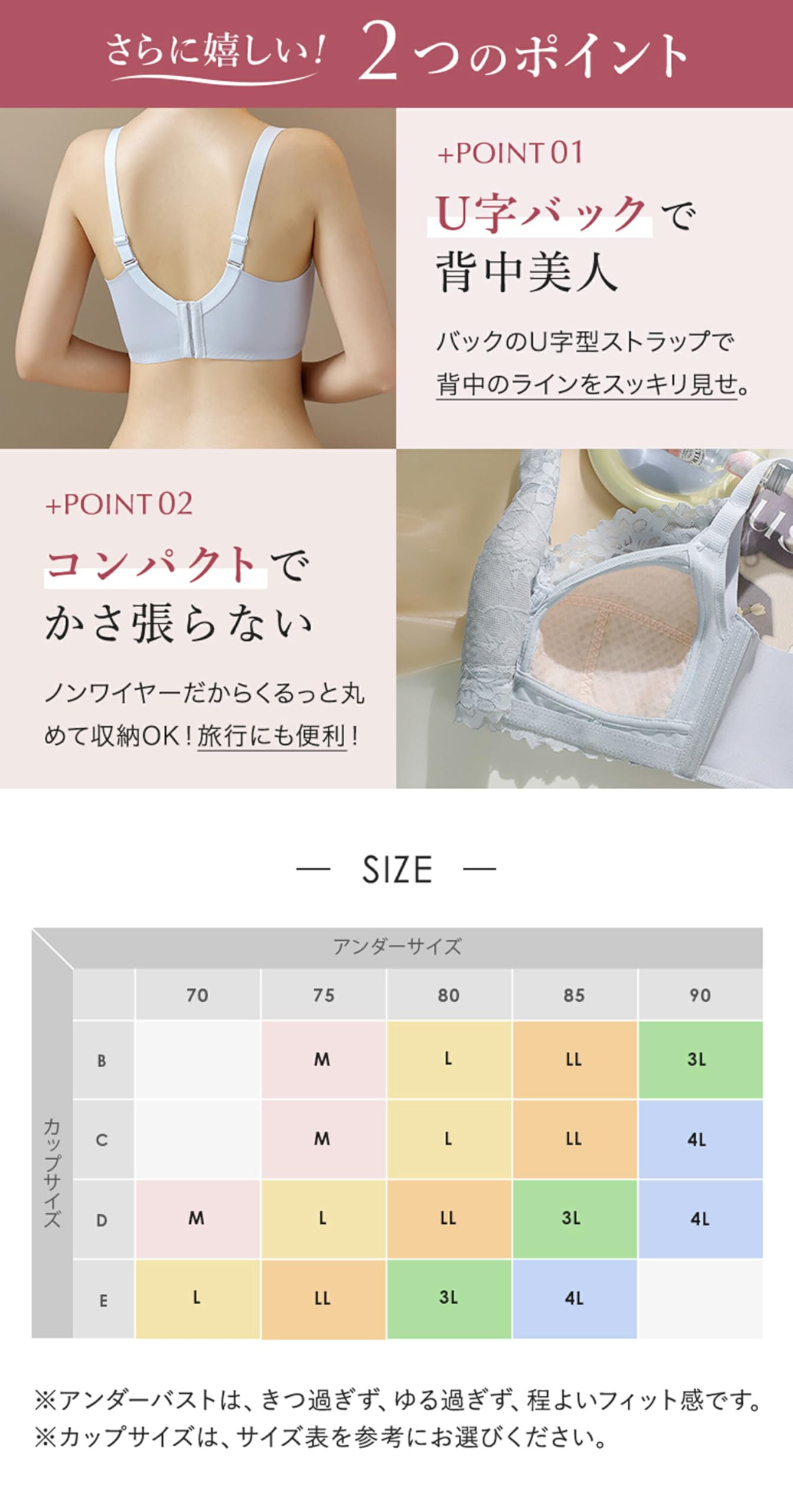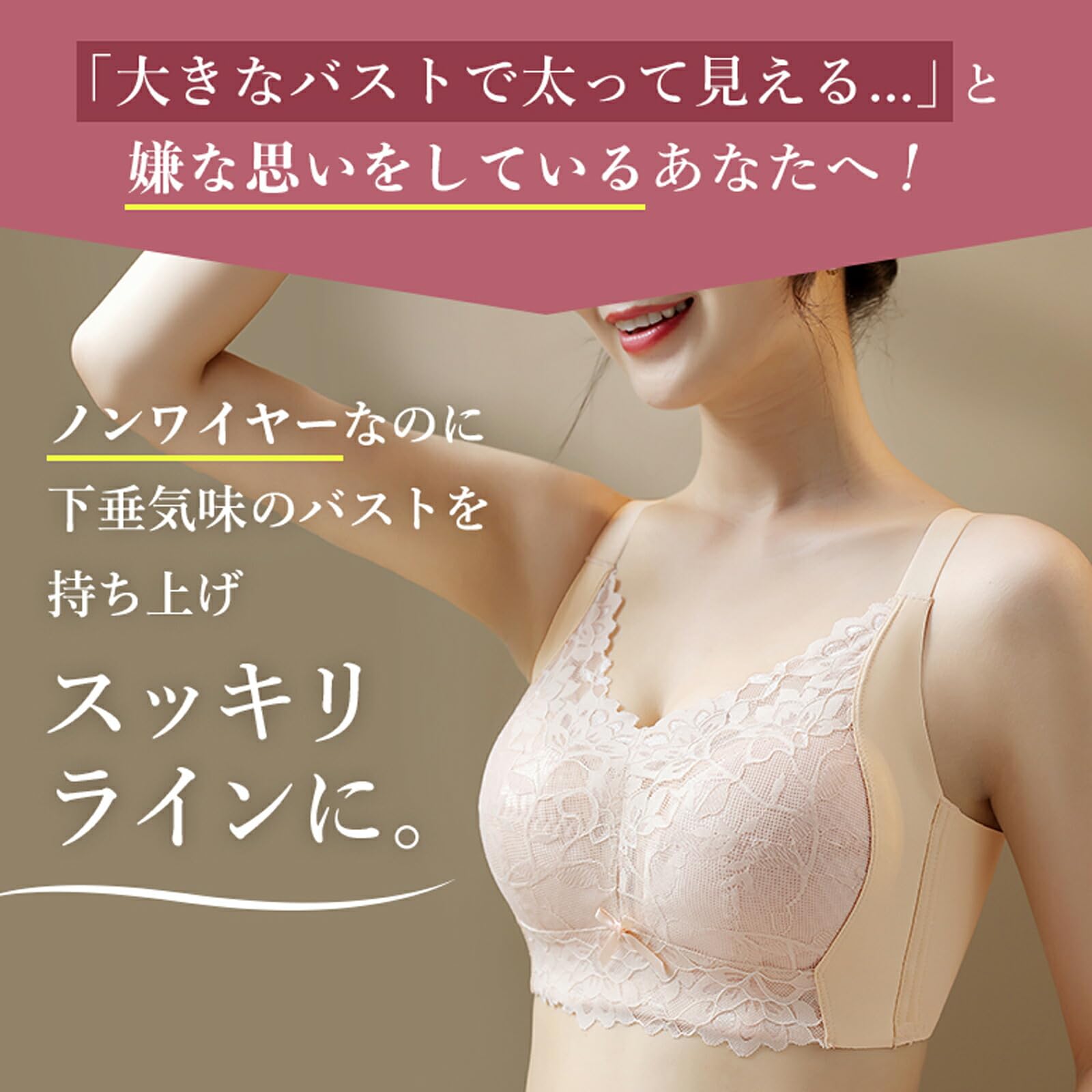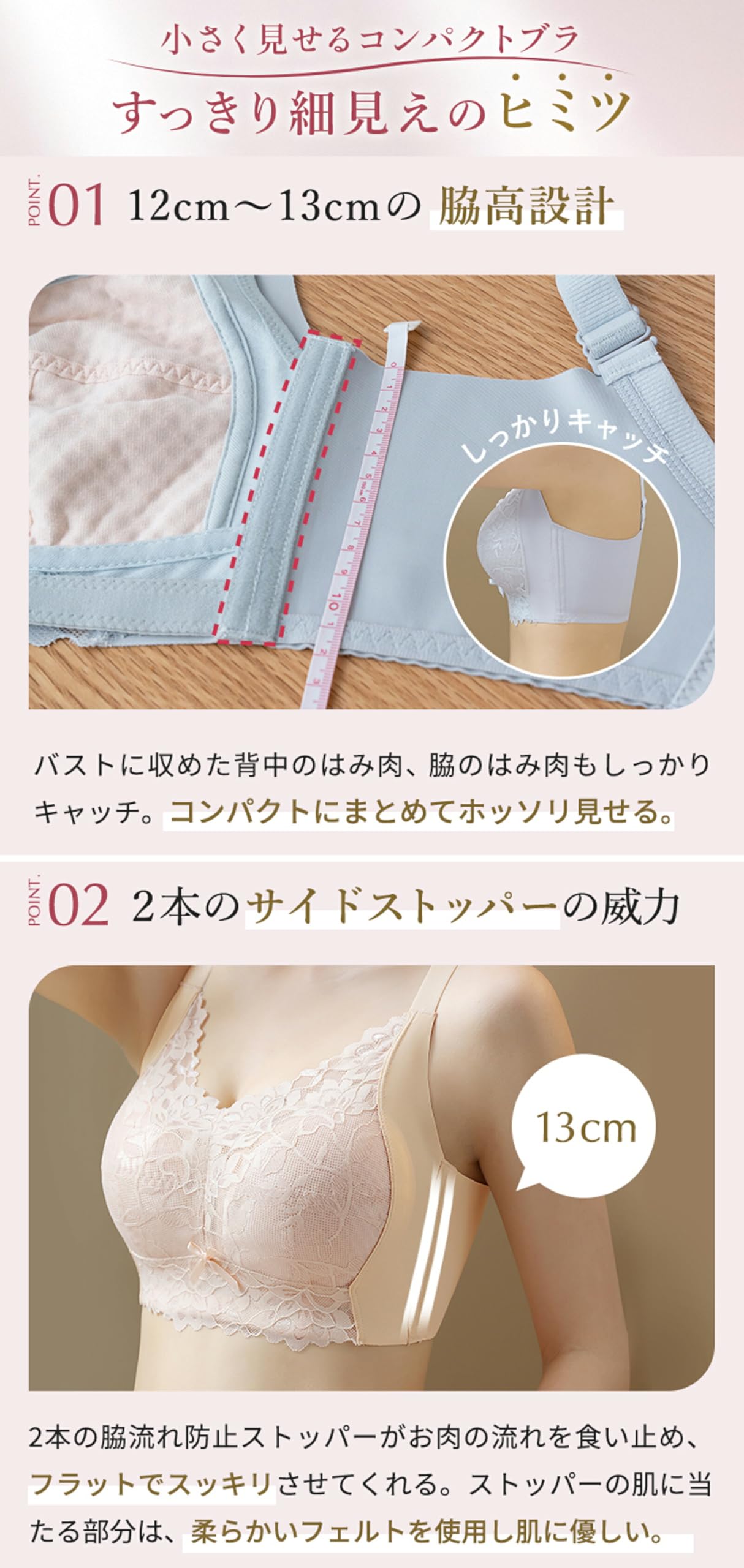 ノンワイヤーなのに下垂気味のバストを持ち上げスッキリラインに! 12cmの脇高設計&2本のサイドストッパーの威力!約12cmの脇高設計で、背中のはみ肉、脇のはみ肉もバストに収め、コンパクトにまとめることでホッソリ見せます。2本の脇流れ防止ストッパーが、お肉の流れを食い止め、段差のないフラットでスッキリラインに。